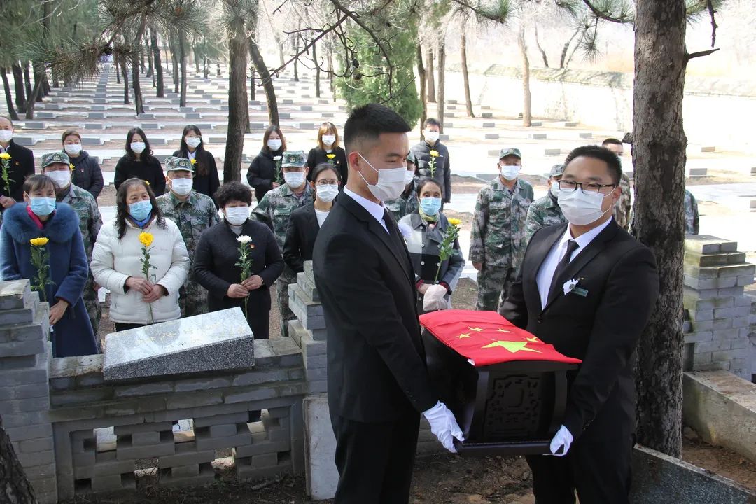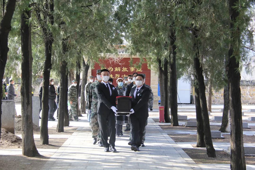 上午9时,八达岭烈士陵园内庄严肃穆,哀乐低回,承载着陈连才烈士遗骸的棺木覆盖着国旗,在工作人员的护送下进入八达岭烈士陵园,安葬在新的烈士墓中。