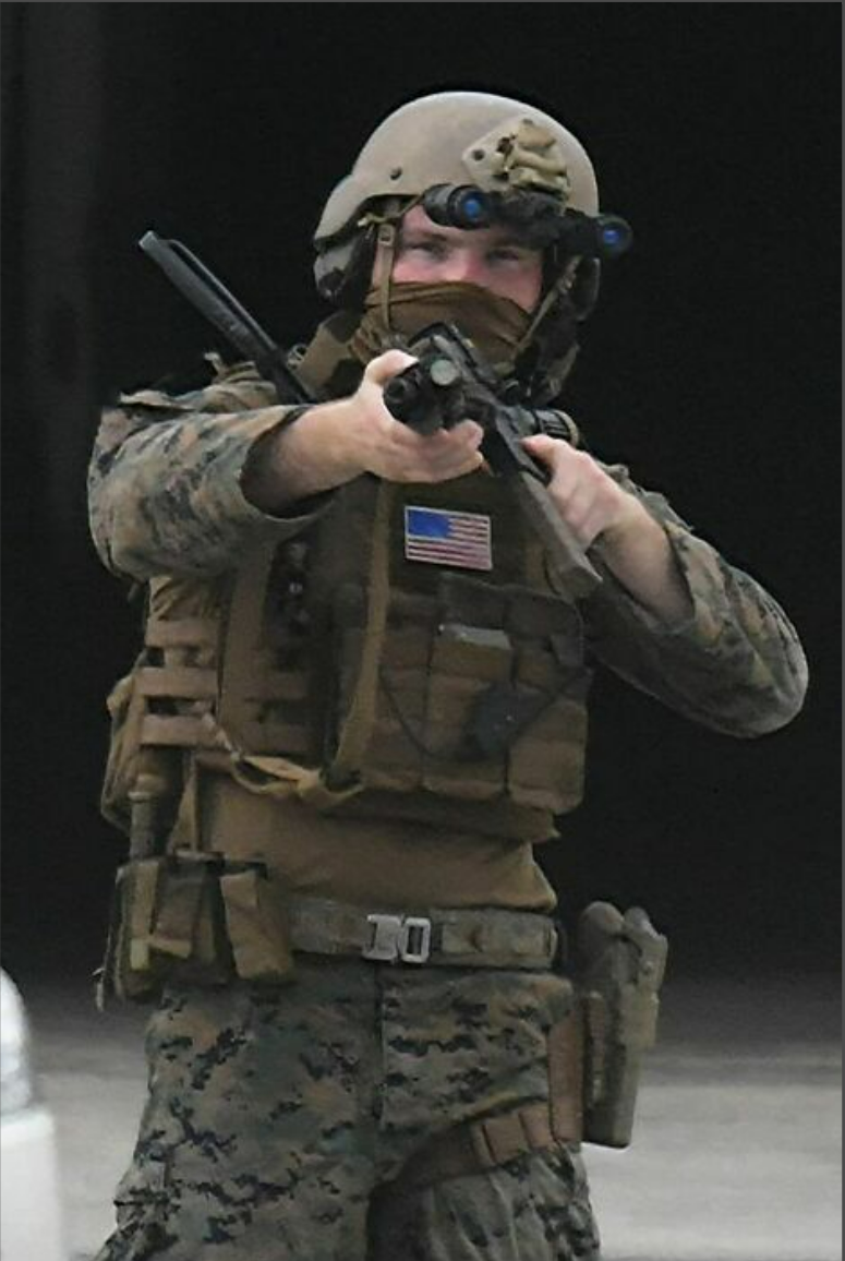 和其他媒体机构一样,松元当天也在那霸军港外围的民间用地上进行采访。透过美军基地的围栏可以看到,在那霸军港的仓库前,聚集了大约20名配备枪支的美军士兵以及车辆,他们正在此进行军事训练,松元于是将拍摄角度选在了仓库对面。