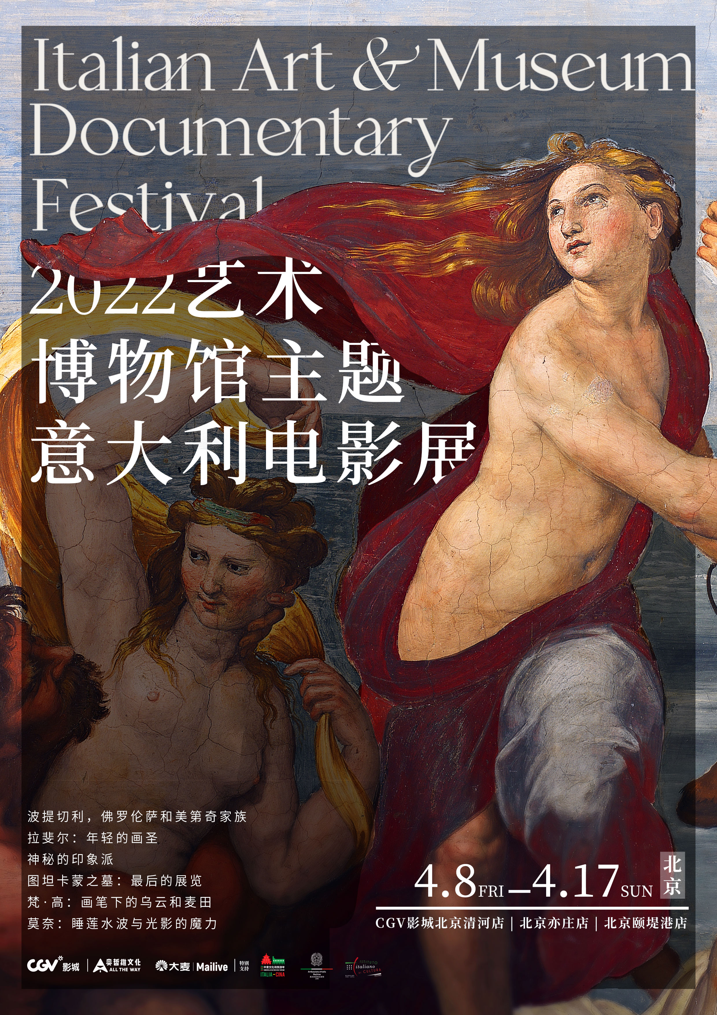 此次影展由CGV影城和奥哲维文化共同举办,意大利驻华大使馆支持,这也是该主题活动第二届举办。参展的影片包括《波提切利,佛罗伦萨和美第奇家族》《拉斐尔:年轻的画圣》《神秘的印象派》《图坦卡蒙之墓:最后的展览》四部全新作品和《梵·高:画笔下的乌云和麦田》《莫奈的睡莲:水波与光影的魔力》两部经典重映。
