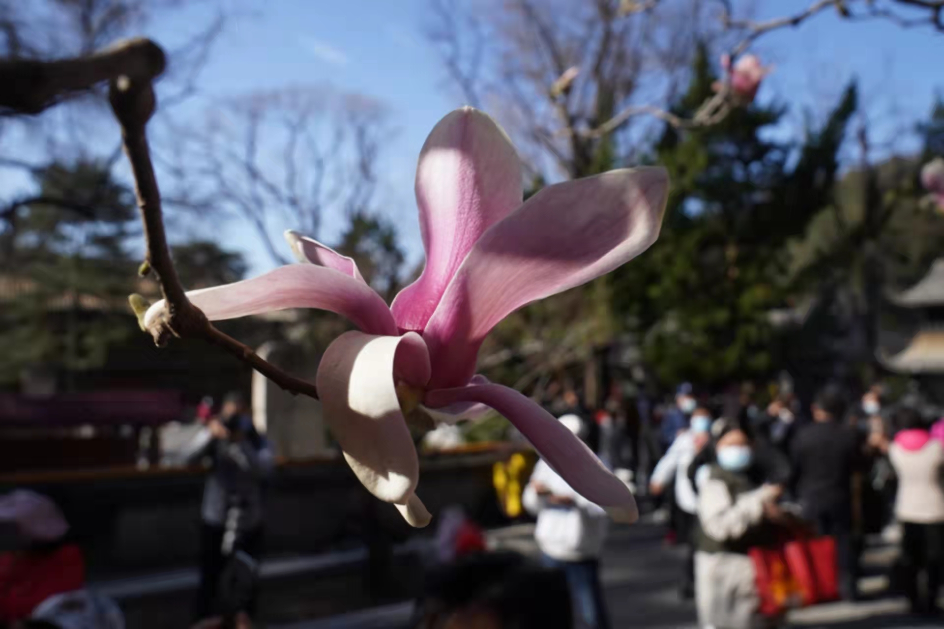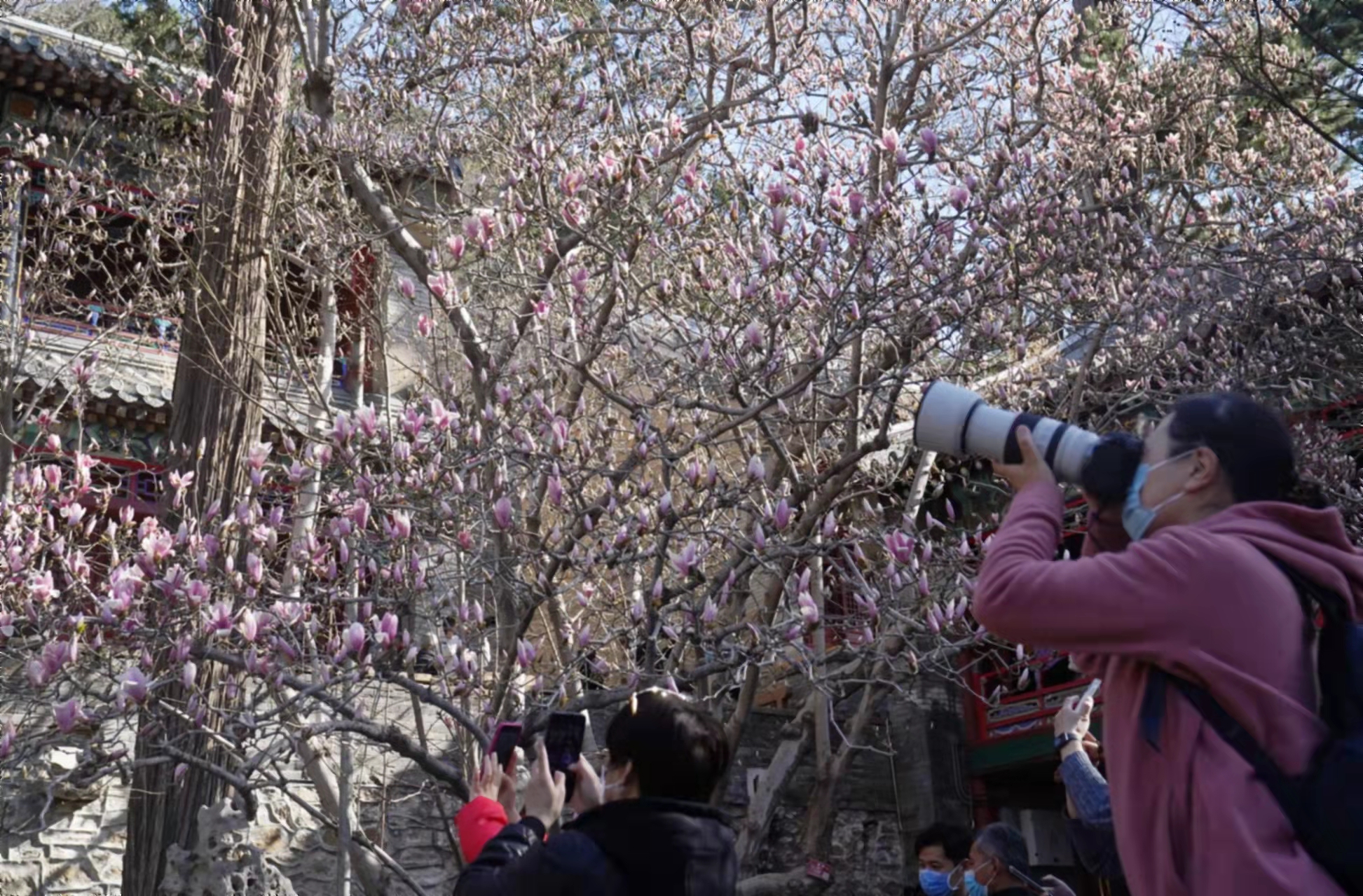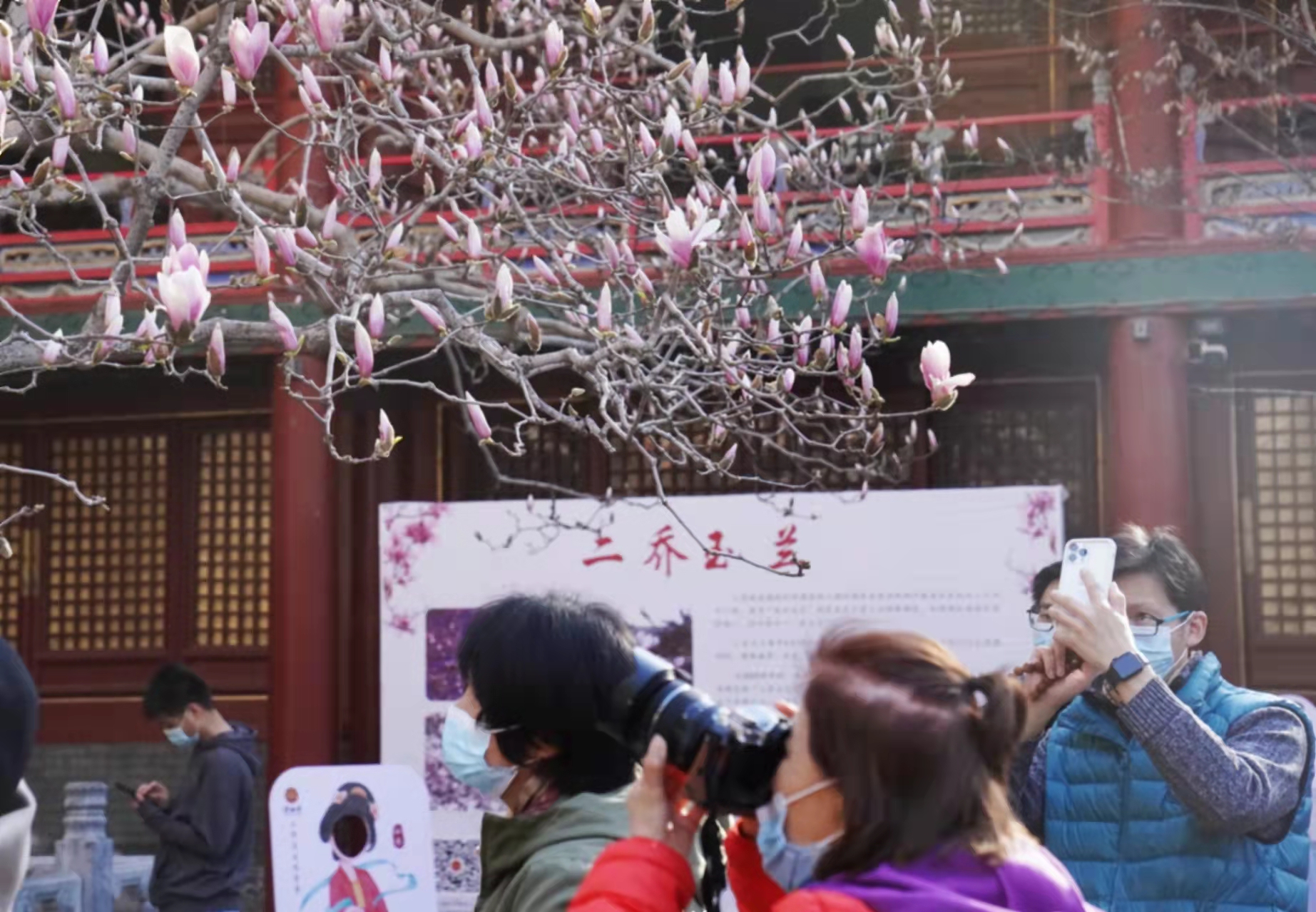 4月3日,许多游客赶来门头沟区潭柘寺景区一睹二乔玉兰的风采。相传三国时期大小二乔貌美如花,潭柘寺的这两棵玉兰树龄已达400多年,每年4月上旬盛花期,紫白双色的玉兰花如灿烂云霞,故被称为二乔玉兰。