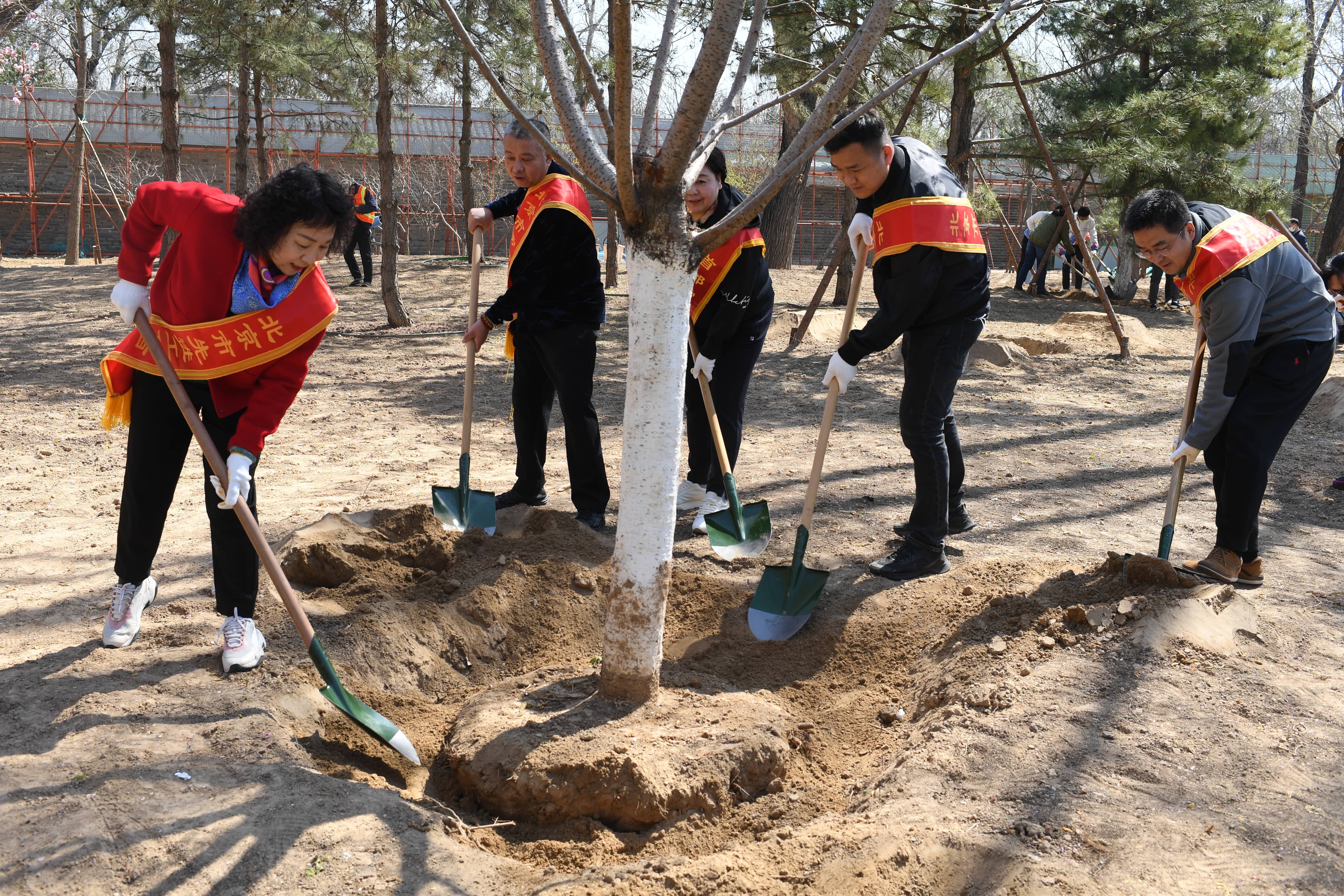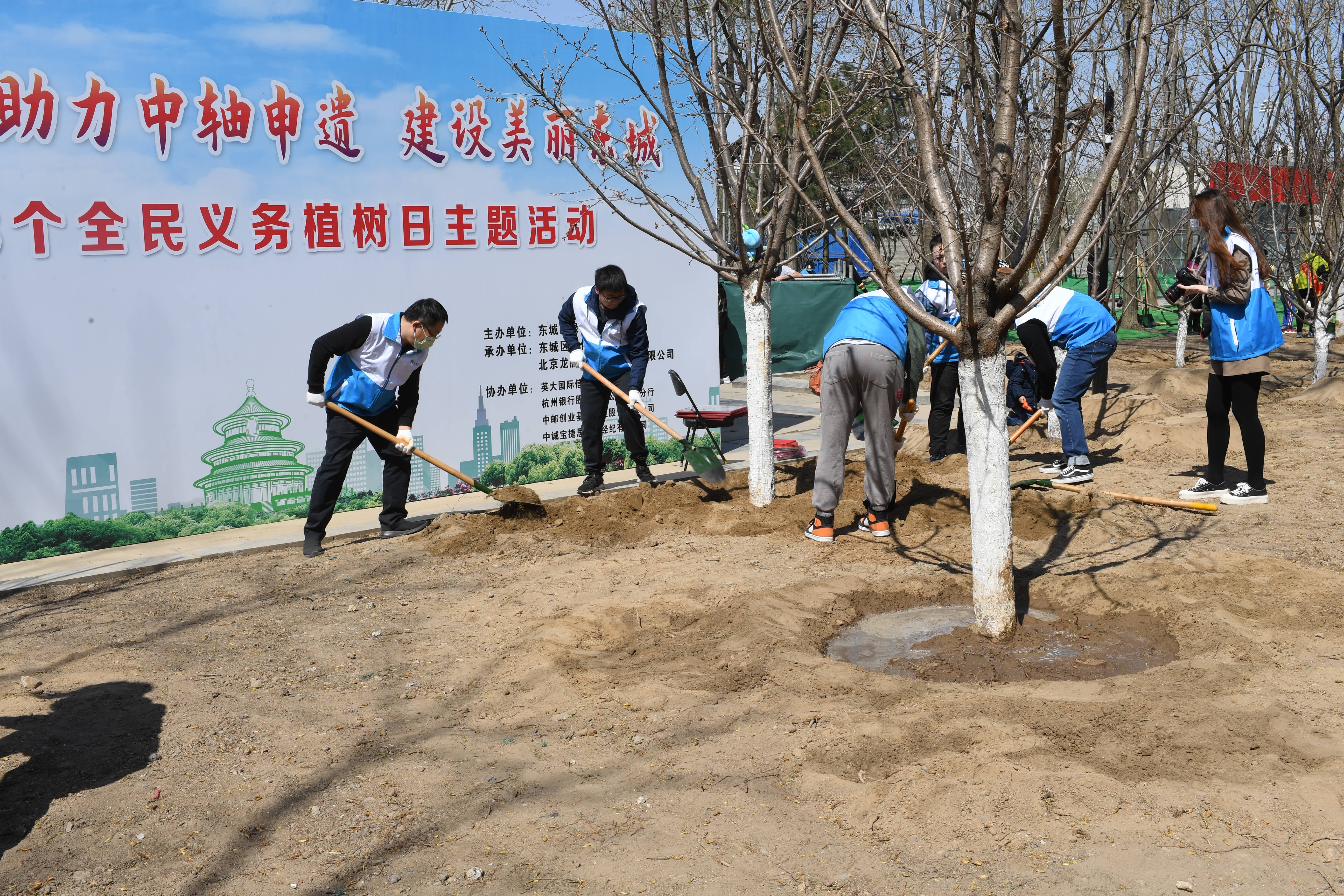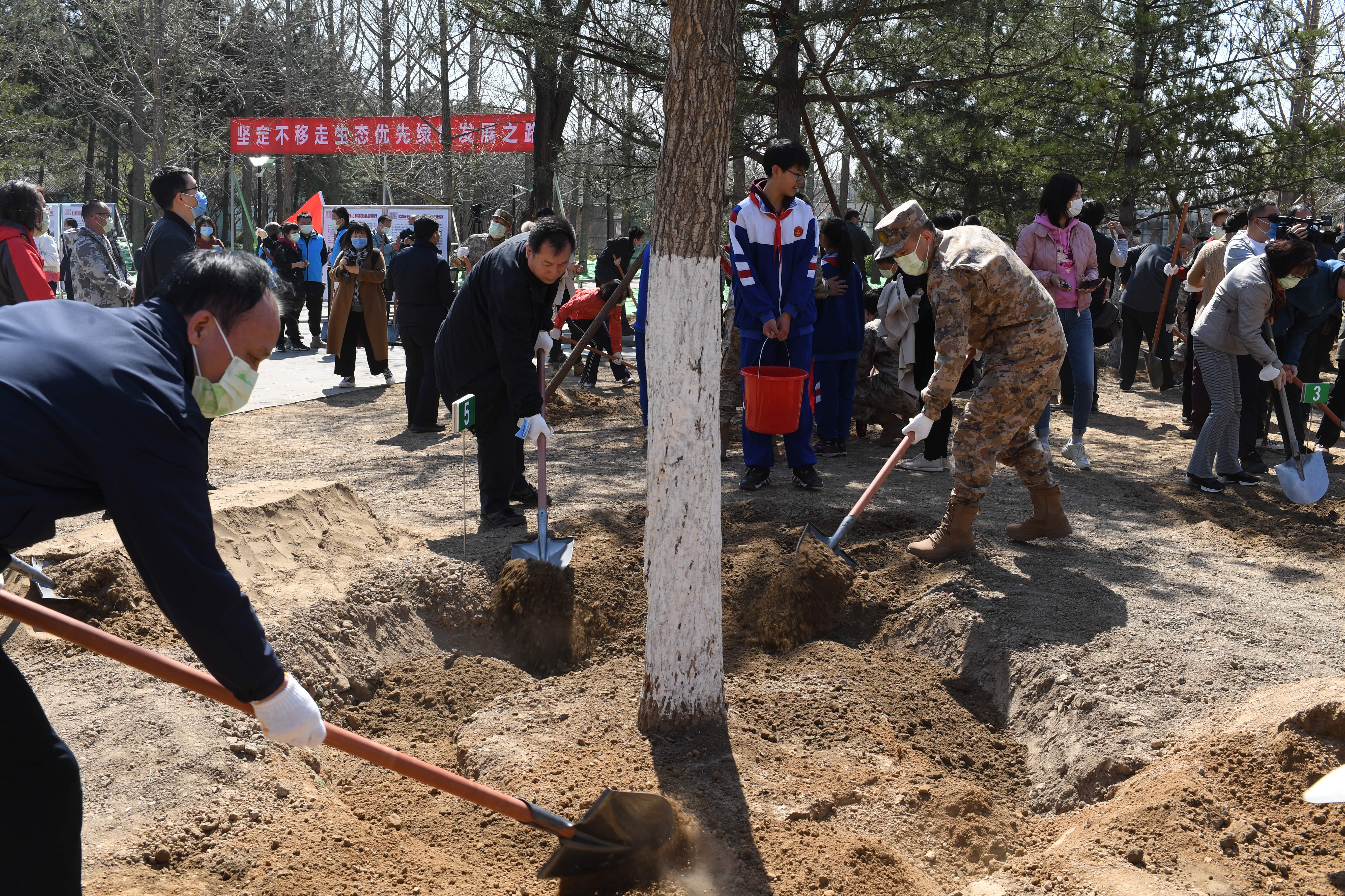 春风拂绿,上午11点,天坛公园西门游人纷至,西门北侧,参加植树的干部群众撸起袖子,填土入坑,不一会儿,油松、元宝枫、银杏、海棠等170株乔灌木迎风舒展。