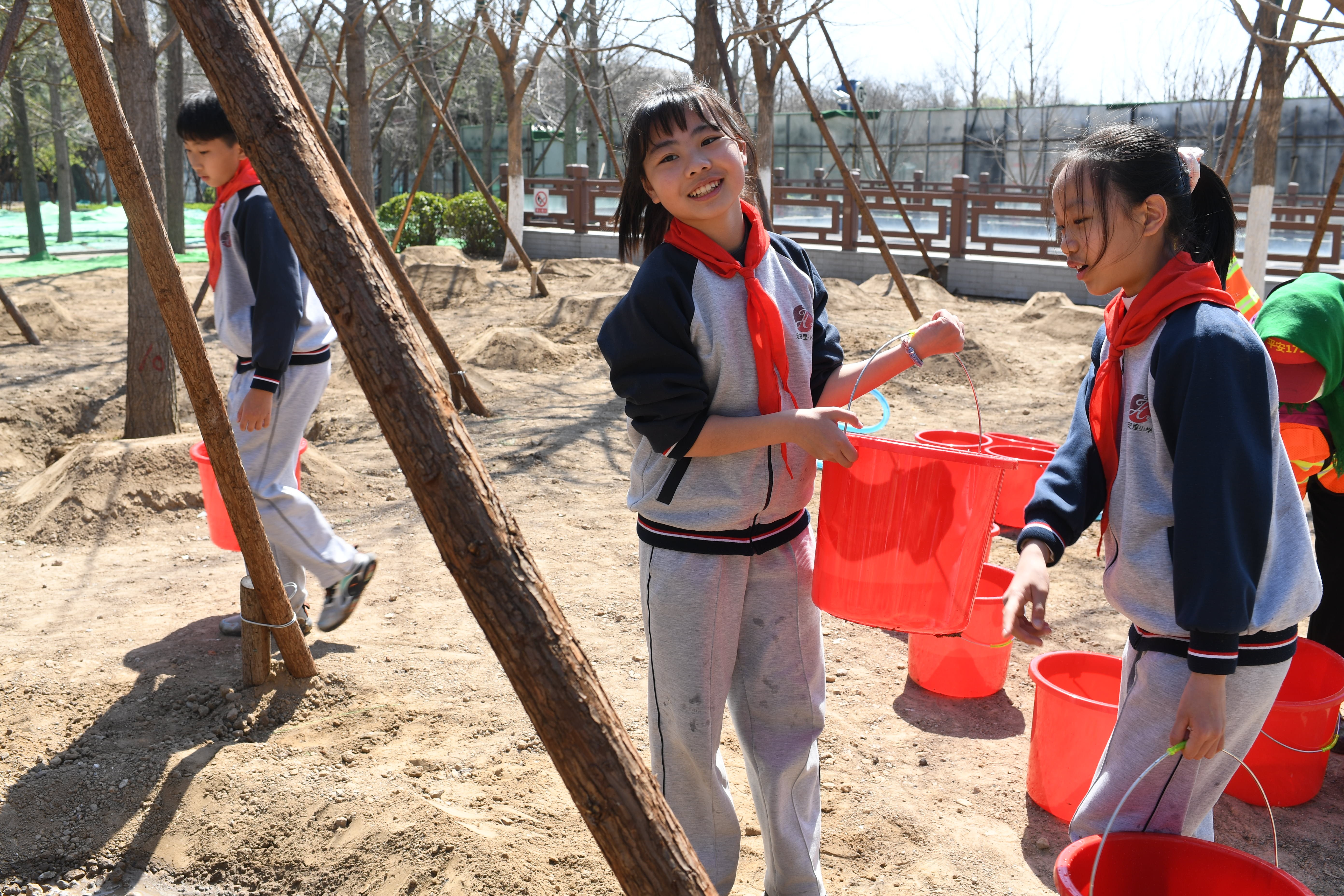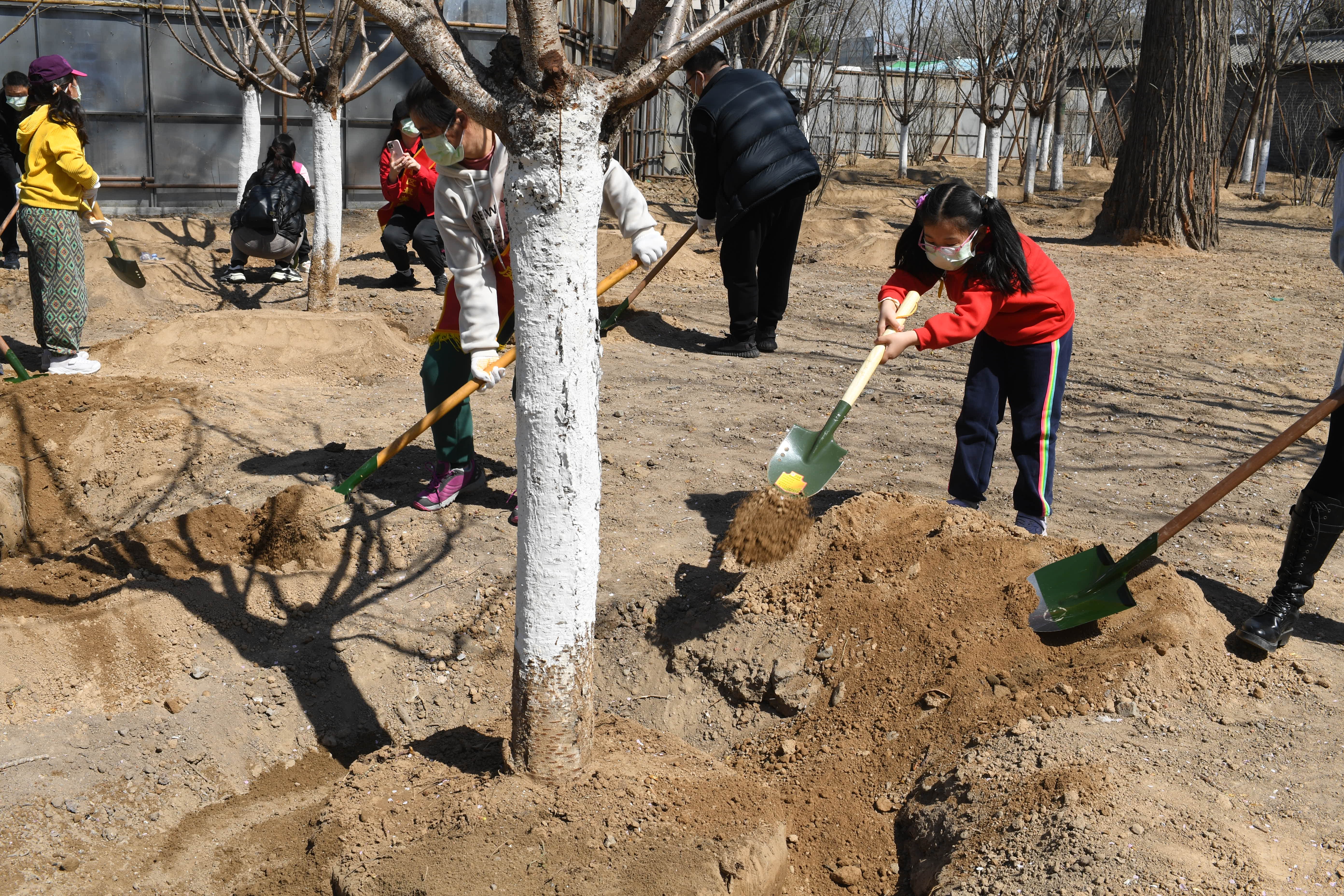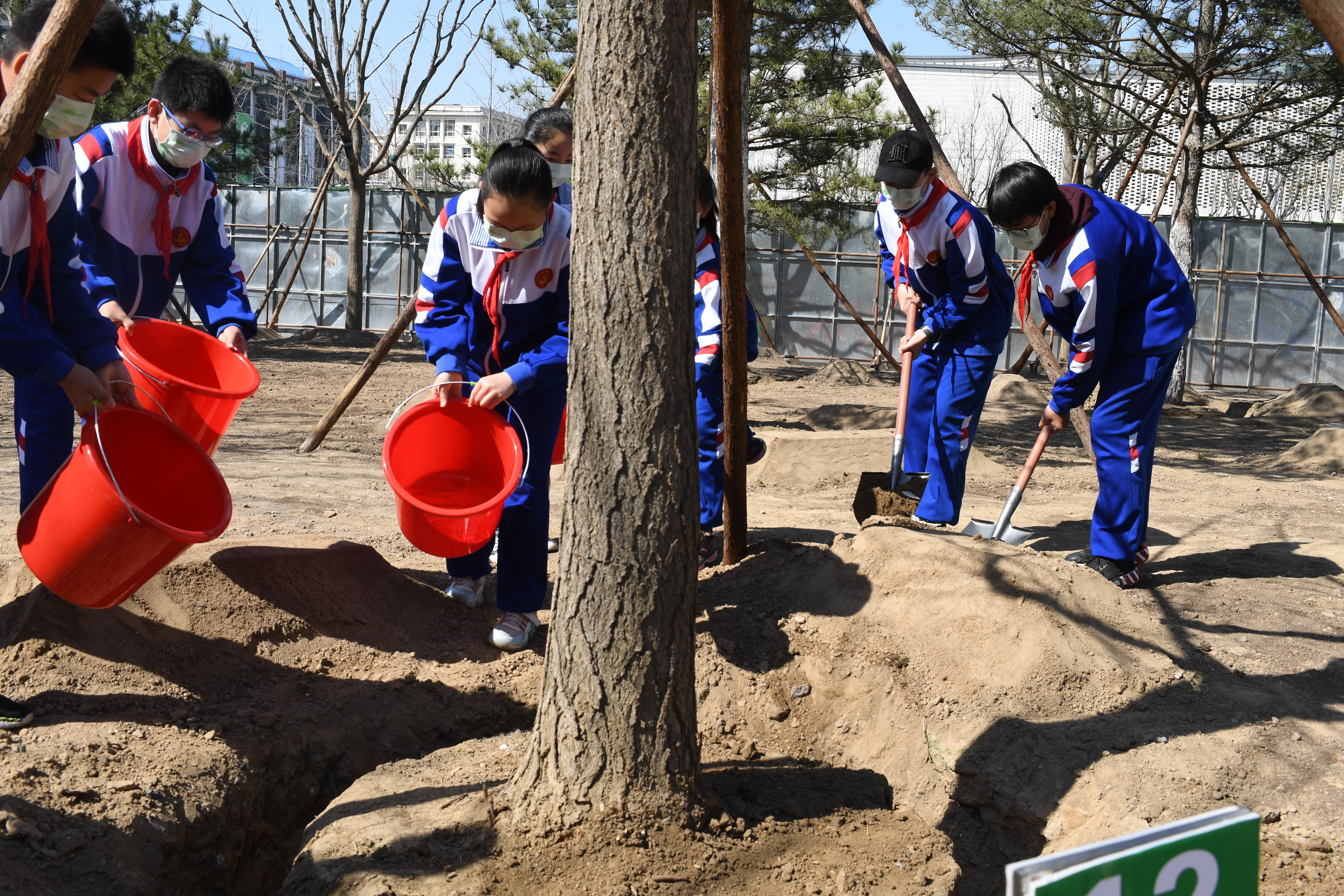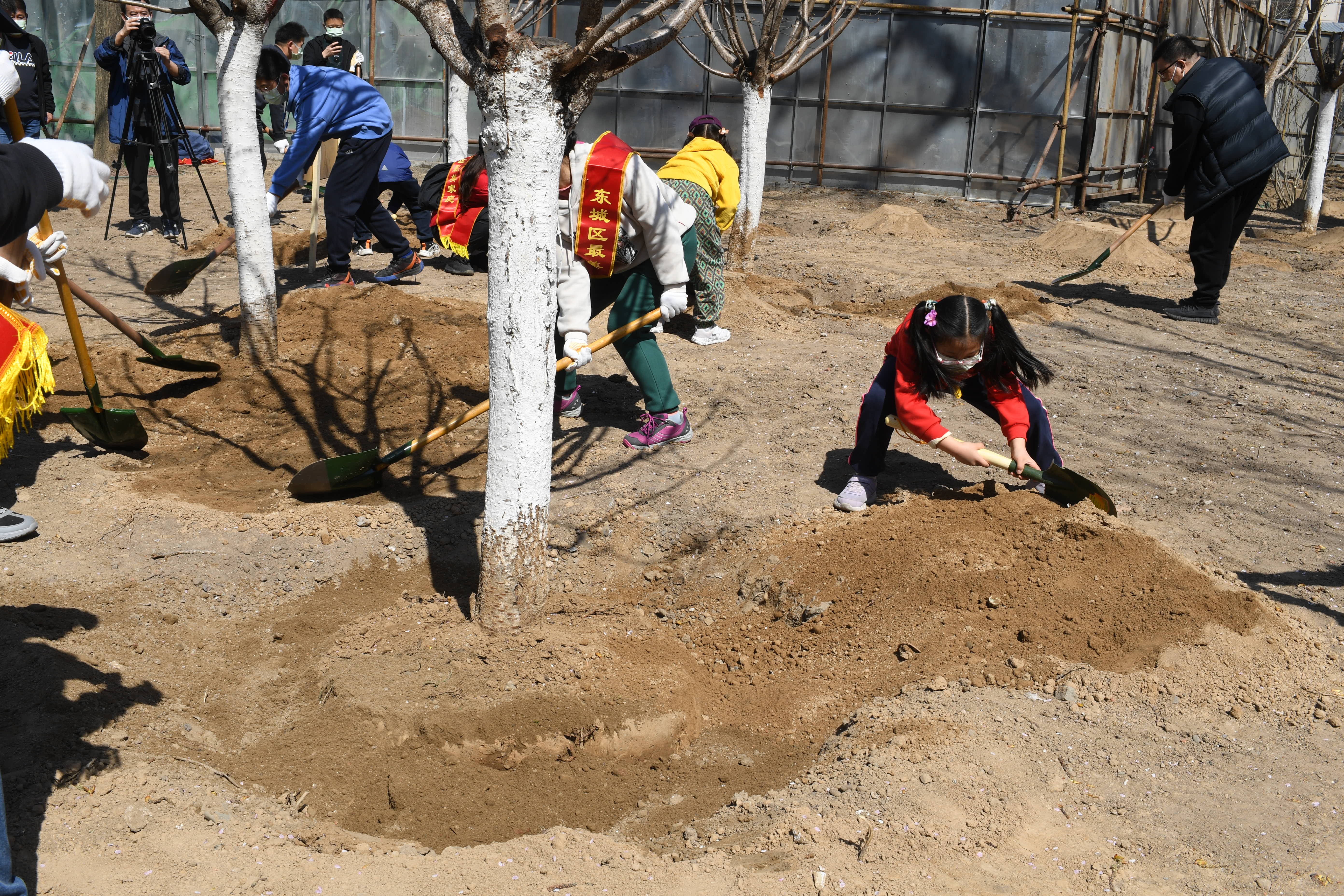春风拂绿,上午11点,天坛公园西门游人纷至,西门北侧,参加植树的干部群众撸起袖子,填土入坑,不一会儿,油松、元宝枫、银杏、海棠等170株乔灌木迎风舒展。