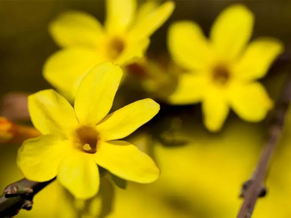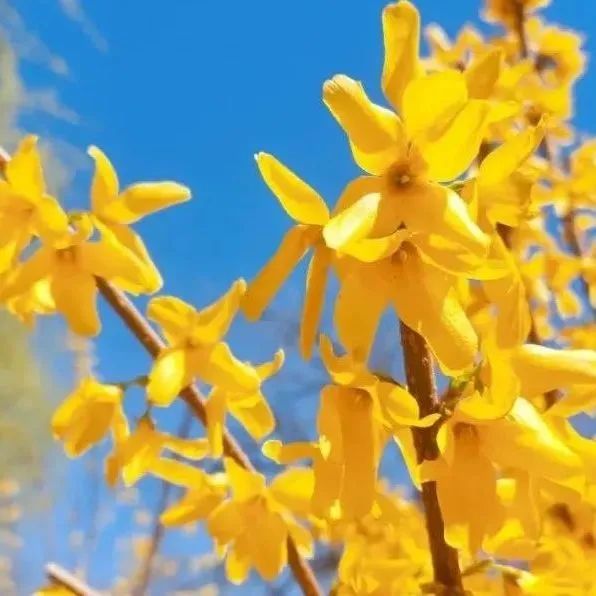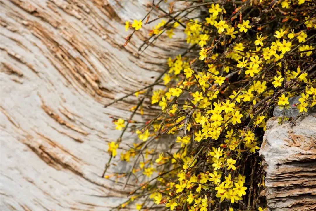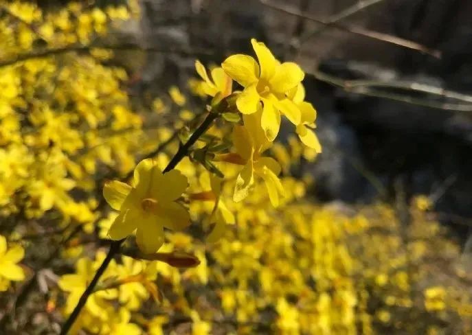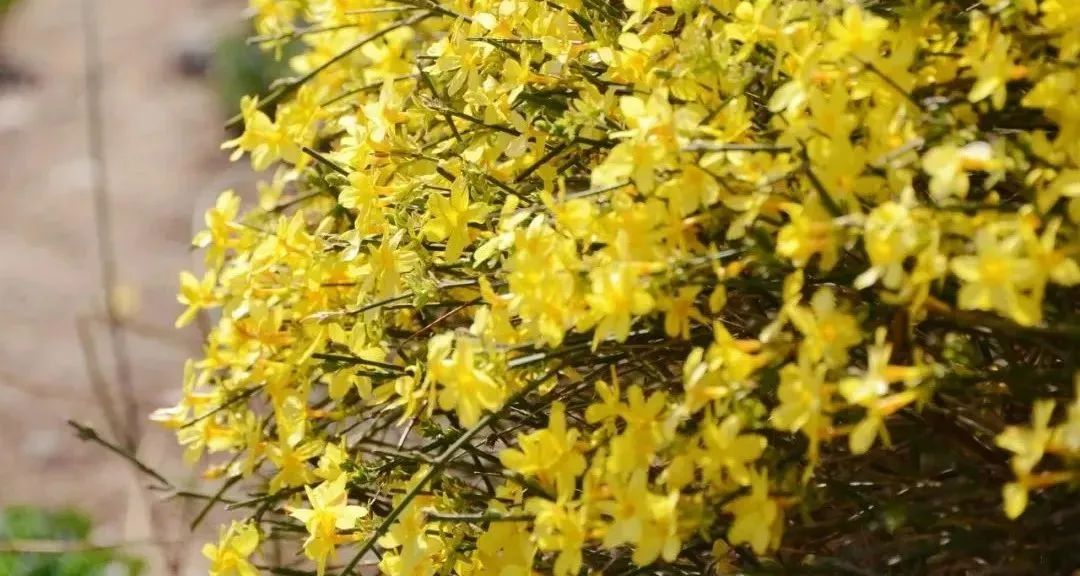 当园林和田野依然乍暖还寒、万籁俱寂的时候,迎春花的枝条密密麻麻、一团团、一簇簇,顶起了鹅黄色的小花。