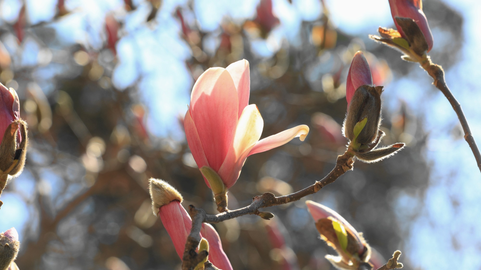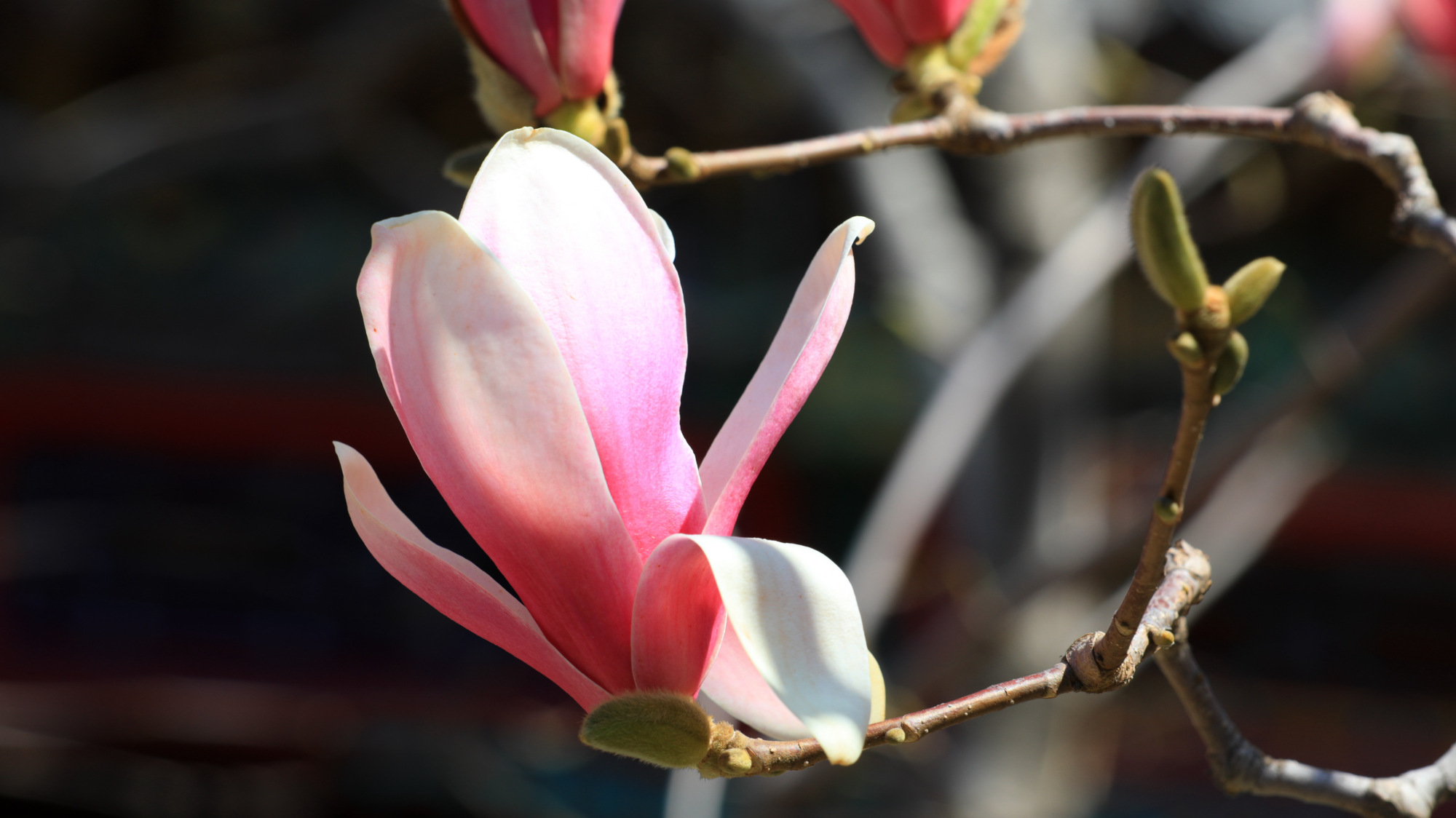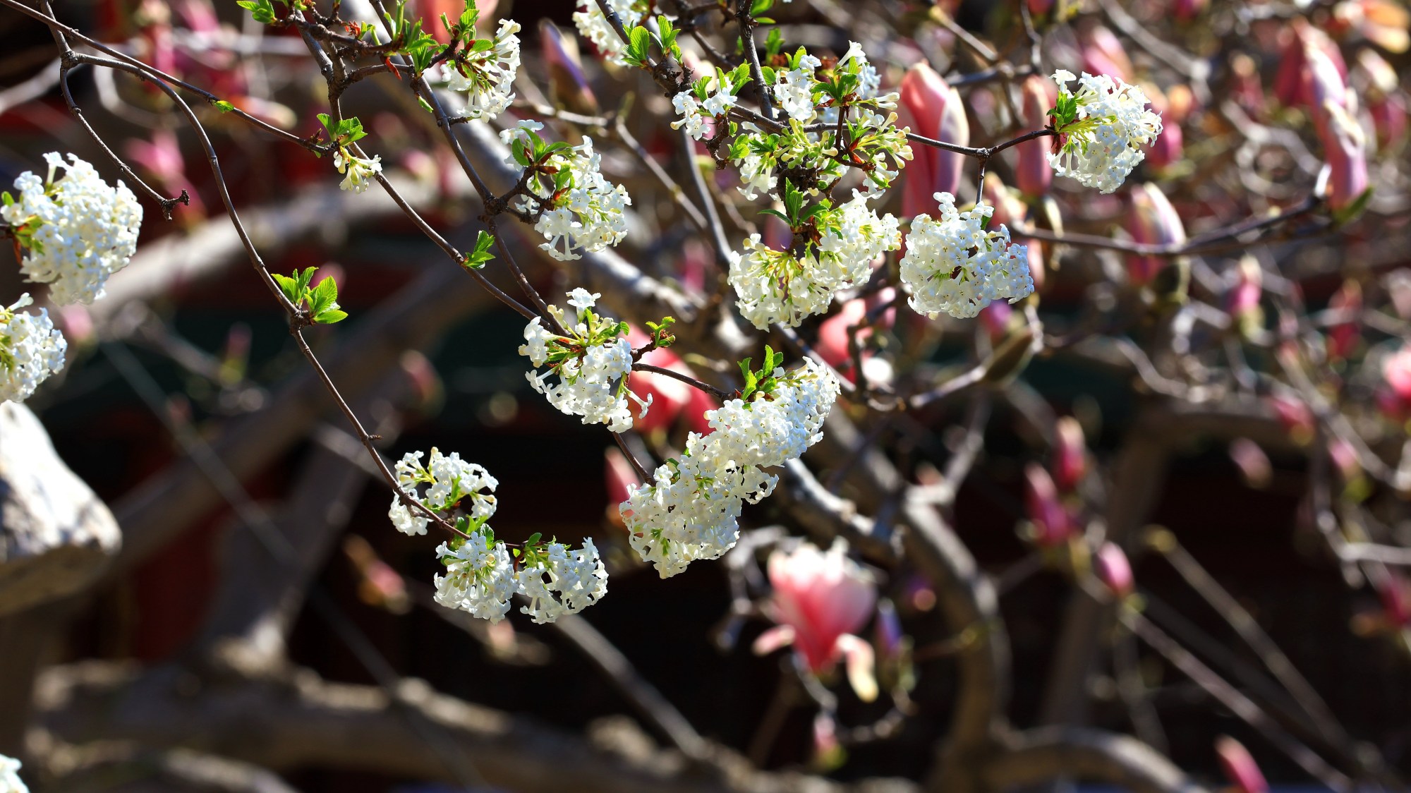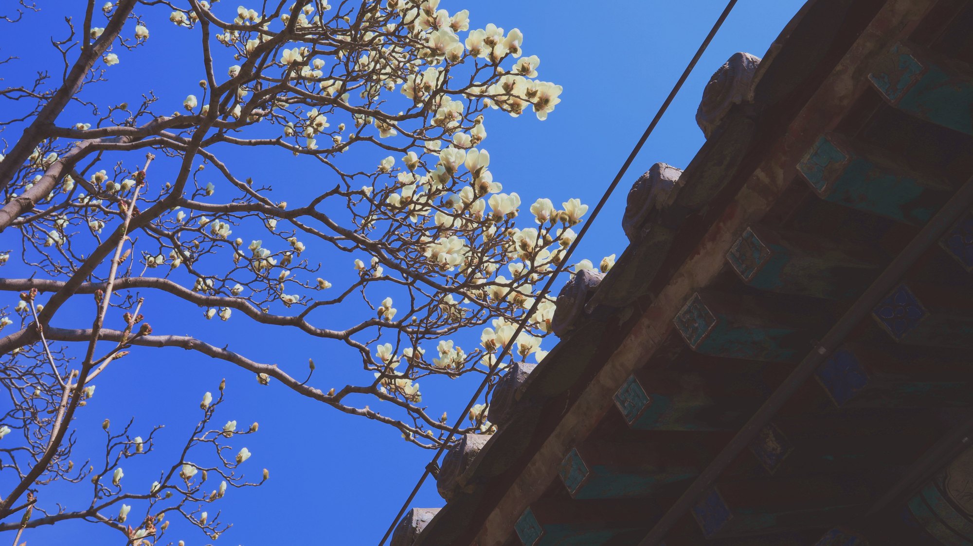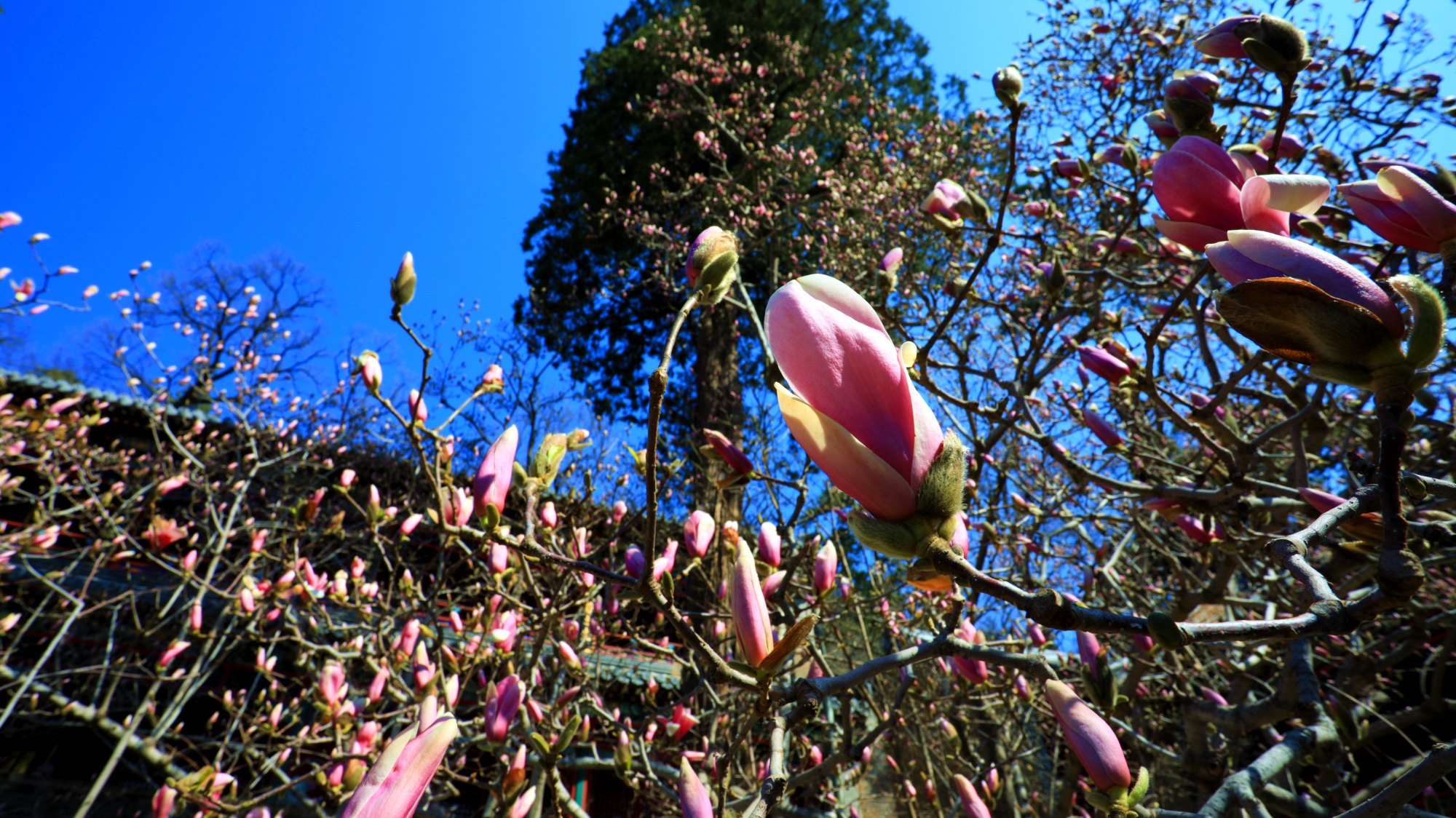 亭亭玉立的二乔玉兰成为潭柘寺春日的焦点,千年古刹也因二乔玉兰和古探春的竞相开放变得色彩缤纷。目前,除了最具盛名的“二乔”玉兰外,潭柘寺内分散种植的多棵白玉兰、紫玉兰正值盛花期。