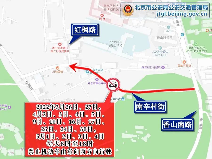 特别提示去往香山地区的市民朋友:4月2日、3日、4日、5日、9日、10日、16日、17日、23日、24日,5月1日、2日、3日、4日,每天8时至18时,南辛村街(红枫路至香山南路段)禁止机动车由东向西方向行驶。