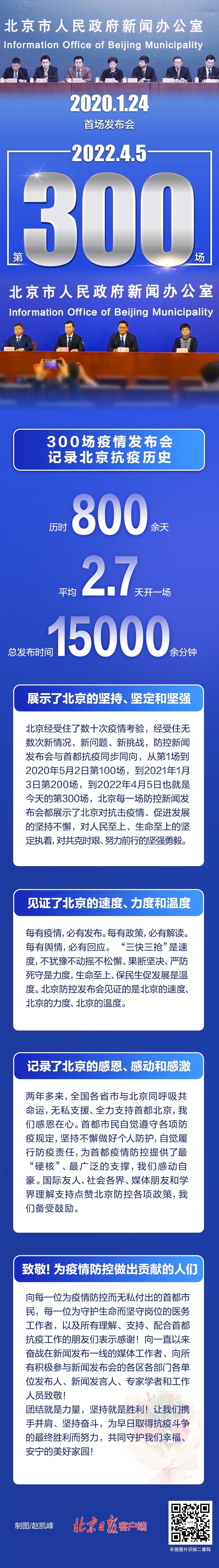 “今天,是北京市新冠肺炎疫情防控工作新闻发布会第300场,对于单一主题特别是对于公共卫生重大突发事件这个主题,举办300场发布会,无论是从国内看,还是从国外看,这是一个前所未有的数字。历时800余天,平均2.7天开一场,总发布时间15000余分钟,展示、见证、记录了北京抗疫历史!”4月5日,北京市疫情防控新闻发布会尾声,北京市委宣传部副部长、市政府新闻办主任、市政府新闻发言人徐和建对300场发布会进行了回顾。