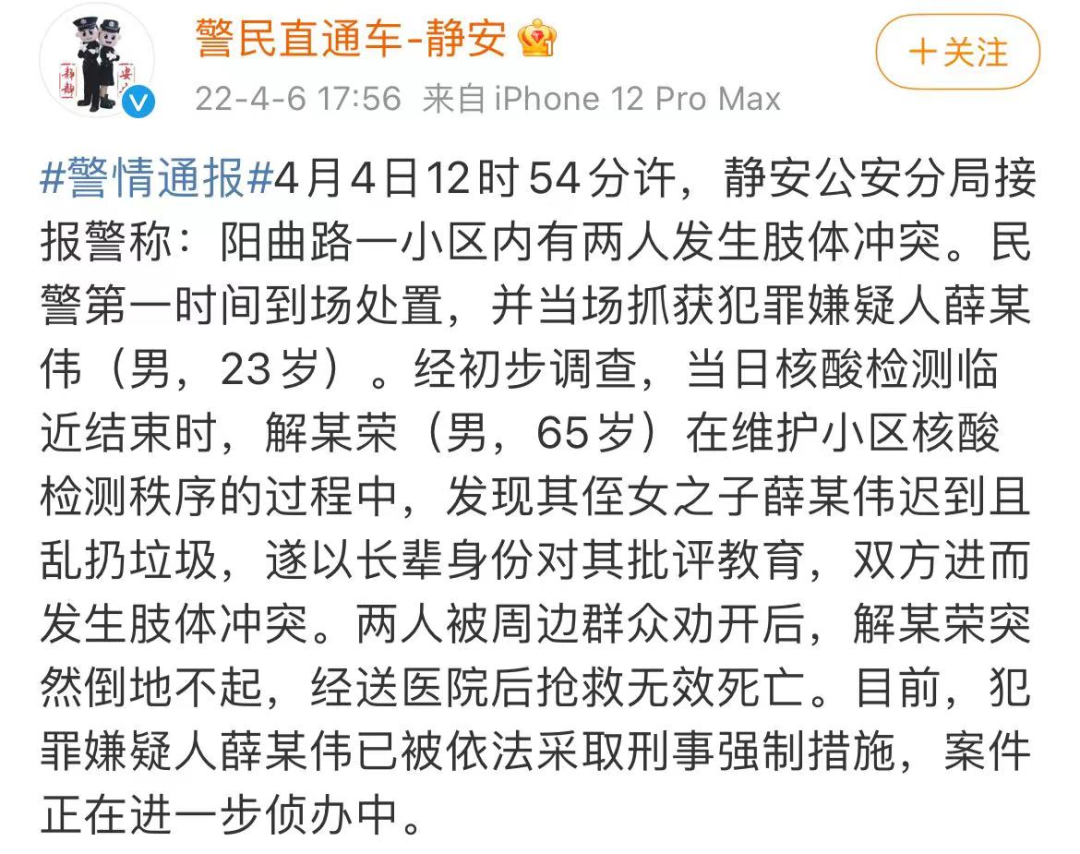 4月4日12时54分许,静安公安分局接报警称:阳曲路一小区内有两人发生肢体冲突。民警第一时间到场处置,并当场抓获犯罪嫌疑人薛某伟(男,23岁)。经初步调查,当日核酸检测临近结束时,解某荣(男,65岁)在维护小区核酸检测秩序的过程中,发现其侄女之子薛某伟迟到且乱扔垃圾,遂以长辈身份对其批评教育,双方进而发生肢体冲突。两人被周边群众劝开后,解某荣突然倒地不起,经送医院后抢救无效死亡。目前,犯罪嫌疑人薛某伟已被依法采取刑事强制措施,案件正在进一步侦办中。