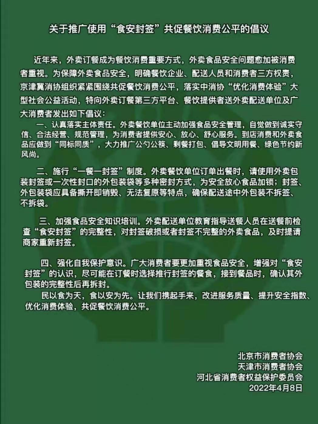 “一餐一封签”!4月8日上午,北京、天津、河北省消协组织联合向外卖餐饮服务企业发出推广使用“食安封签”的倡议。同时,为引导企业养成自觉使用“封签”的习惯,三地消协向外卖餐饮企业赠送500万枚“食安封签”,有需求企业可提出领取申请。
