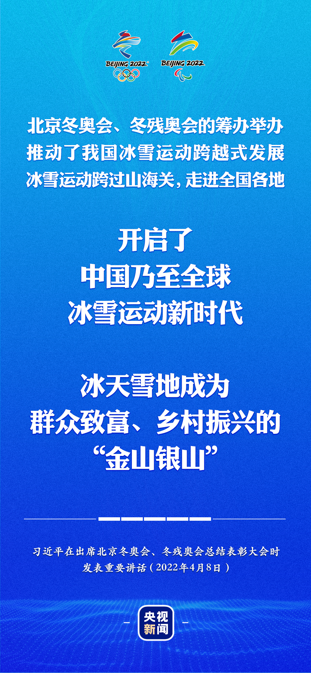 习近平:“三亿人参与冰雪运动”成为现实,人民群众获得感显著增强。北京冬奥会、冬残奥会的筹办举办推动了我国冰雪运动跨越式发展,冰雪运动跨过山海关,走进全国各地,开启了中国乃至全球冰雪运动新时代。筹办以来,我们建设了一大批优质的冰雪场地设施,举办了一系列丰富多彩的群众性冰雪赛事活动,人民群众参与热情持续高涨,参与人数达到3.46亿,冰天雪地成为群众致富、乡村振兴的“金山银山”。冬奥筹办举办全面促进了社会事业发展,残疾人人权得到更好保障,广大群众生活更加丰富多彩!