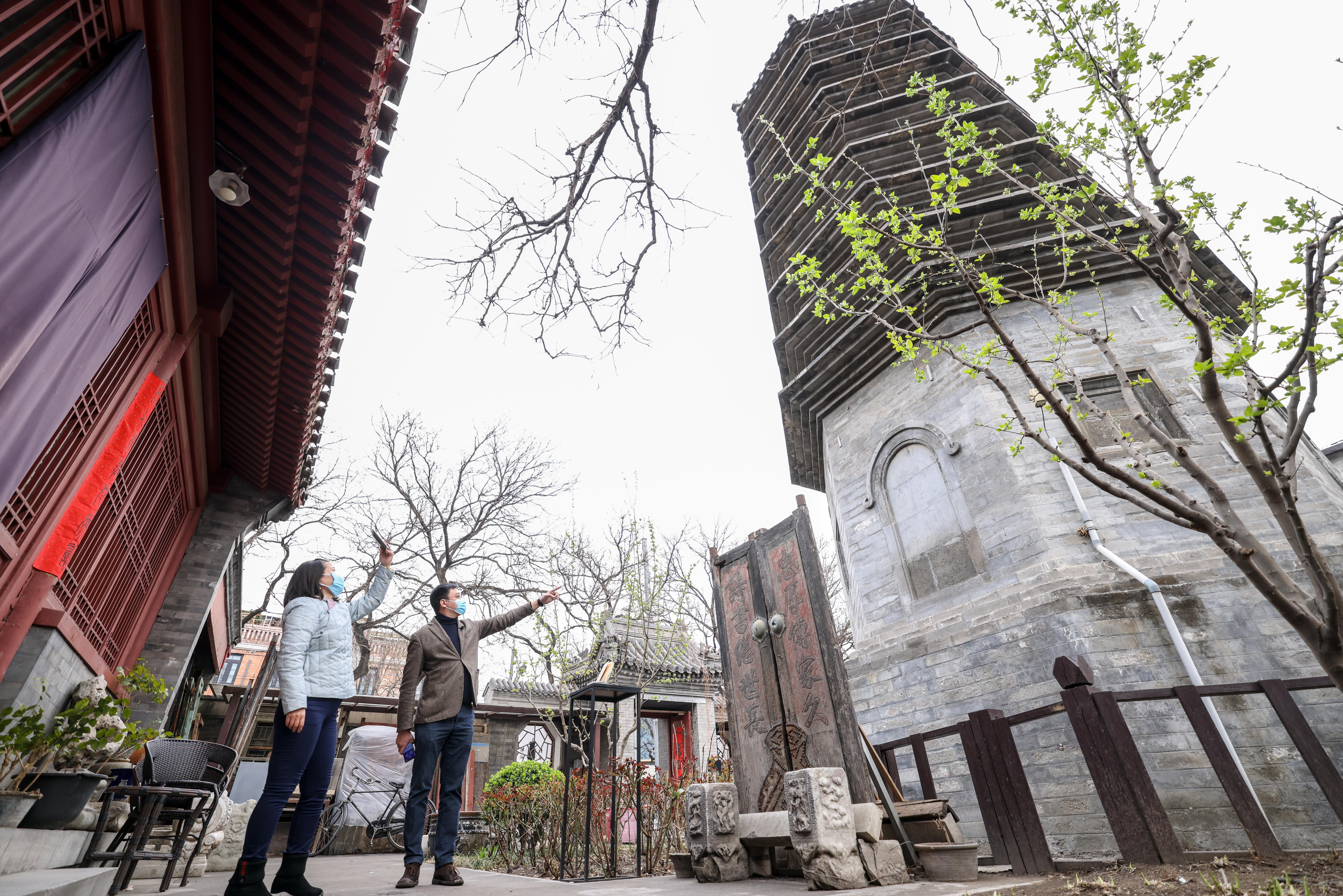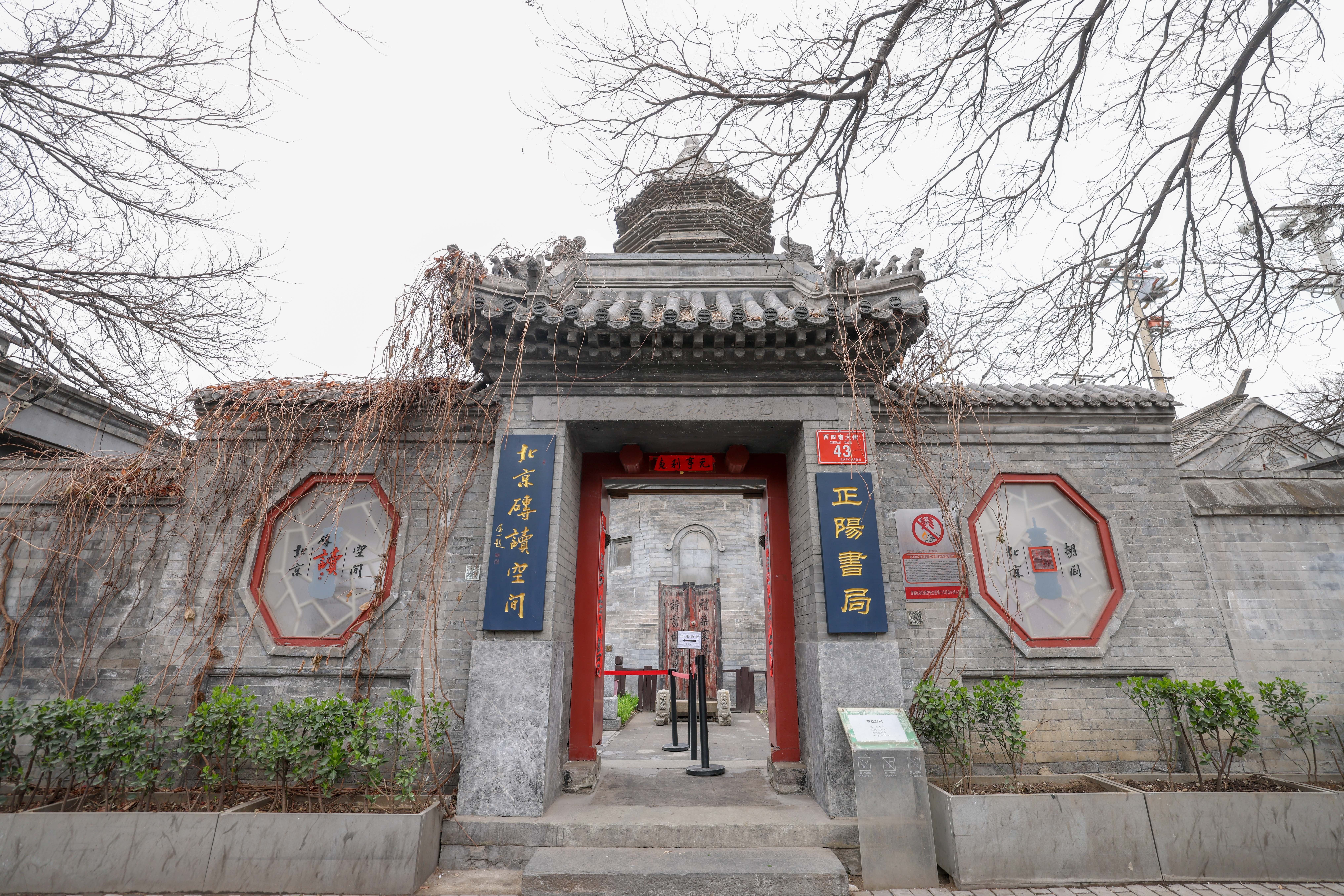正阳书局的小院里装满了旧门板、老门墩、旧书架,配上高耸的元代万松老人塔,让小院里洋溢着浓浓的老北京胡同的氛围。