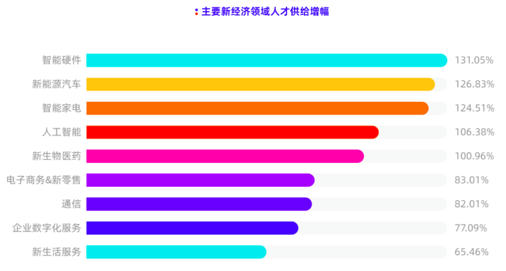 脉脉联合创始人王倩表示,互联网人不只在超级“大厂”寻求发展,产业数字化转型、创新技术推动产业升级背后,由新经济崛起带动的一批新行业机会浮现。报告数据显示,主要的新经济领域人才供给均明显上涨,涨幅较高的行业分别为智能硬件、新能源汽车、智能家电、人工智能及新生物医药。