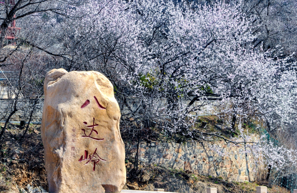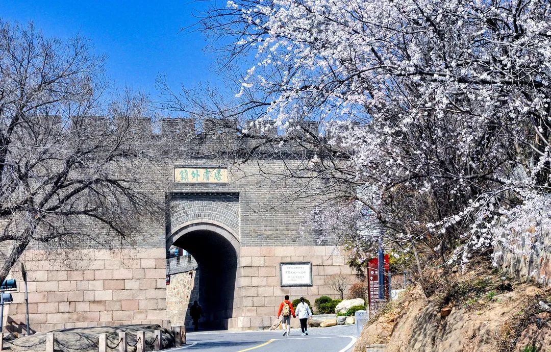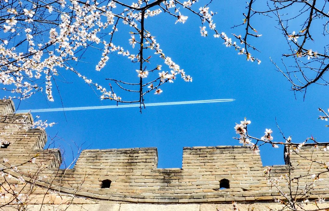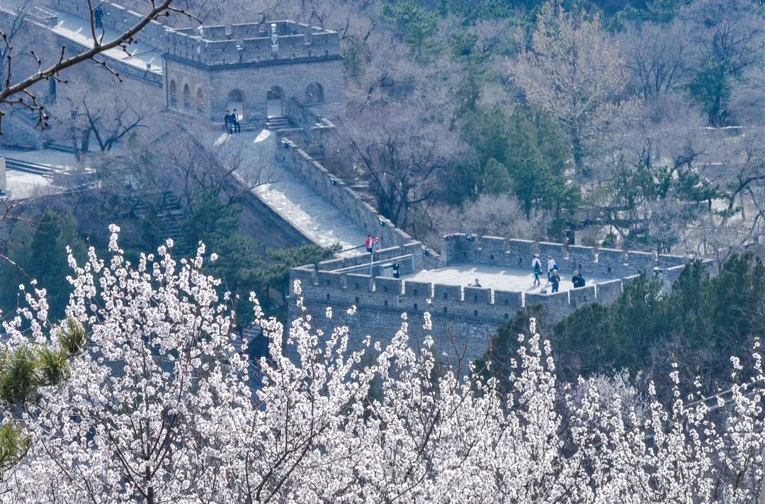 春光烂漫,八达岭长城景区漫山遍野的山杏花已经盛开,一簇簇、一团团柔美的山杏花与雄浑古朴的长城组成了一幅绝美画卷,令游人流连忘返。