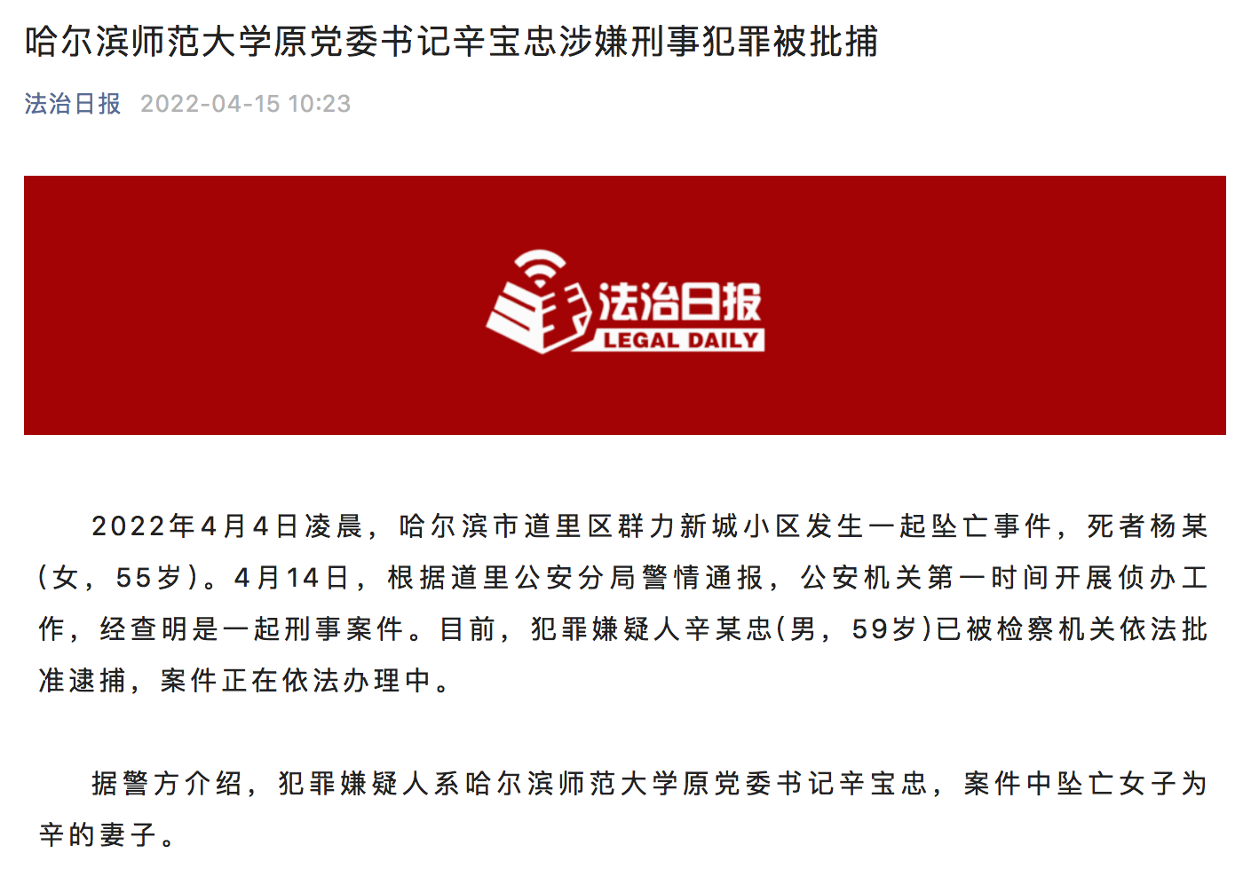 2022年4月4日凌晨,哈尔滨市道里区群力新城小区发生一起坠亡事件,死者杨某(女,55岁)。4月14日,根据道里公安分局警情通报,公安机关第一时间开展侦办工作,经查明是一起刑事案件。目前,犯罪嫌疑人辛某忠(男,59岁)已被检察机关依法批准逮捕,案件正在依法办理中。