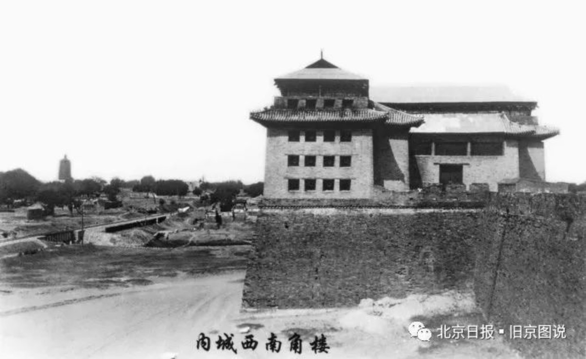 在1933年至1936年之间,德国人格拉夫。卡斯特尔驾驶飞机航拍的照片,通过照片清楚的看到北京内城的西南角楼已经没有了,只剩下了光秃秃的城台。