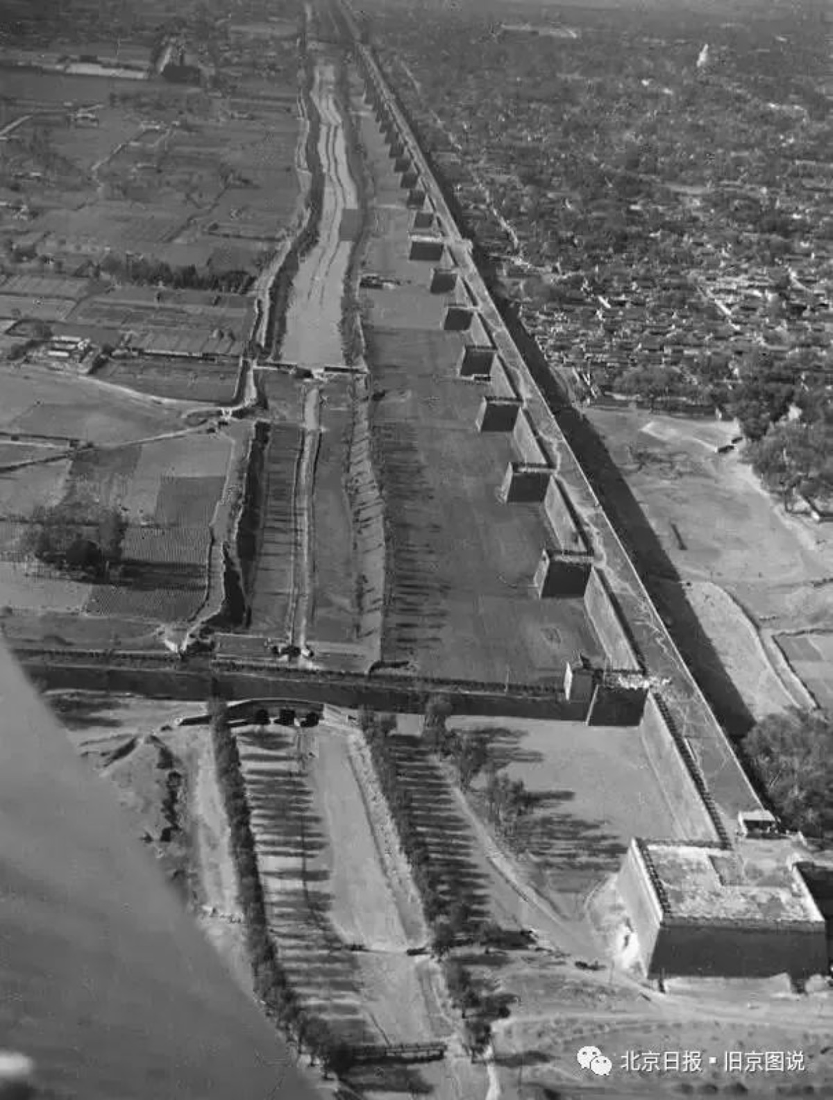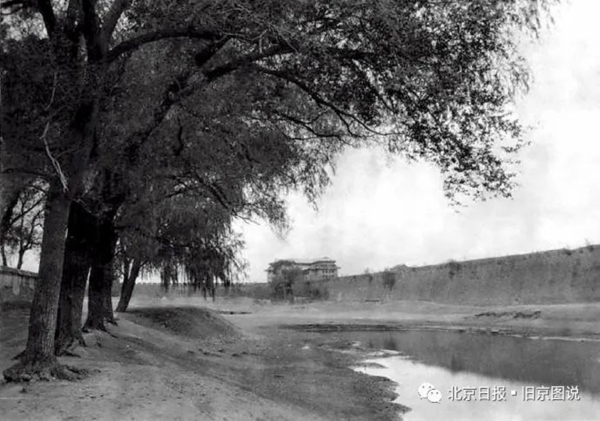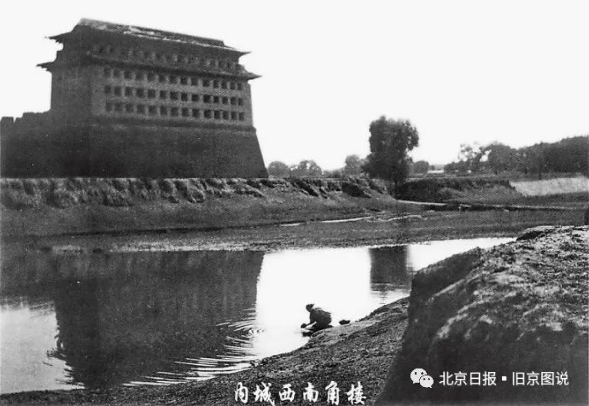 在上世纪50年代,从西北向东南拍摄的内城西城墙和护城河,通过照片没有看到高大的内城西南角楼。