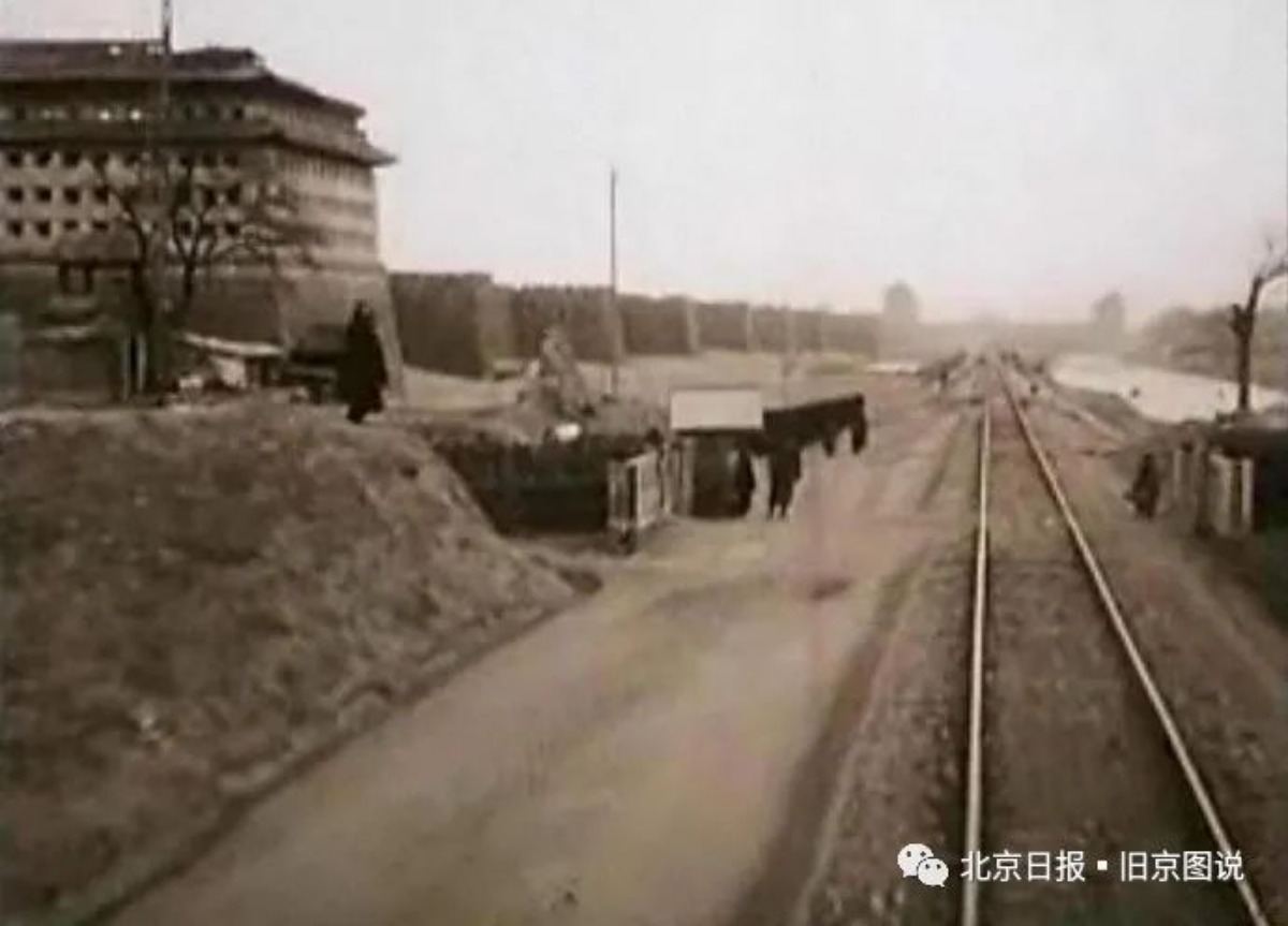 这张照片是从西向东拍的照片,左侧是西南角楼和城墙、一座座墩台右侧是京汉铁路,远处是宣武门。