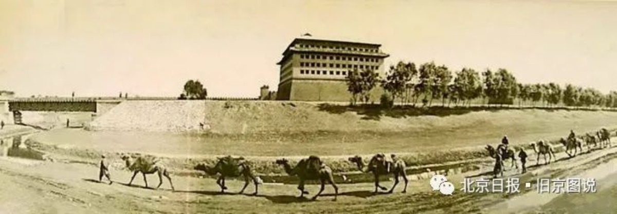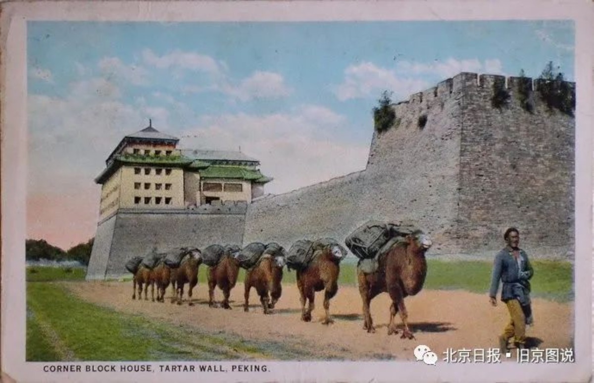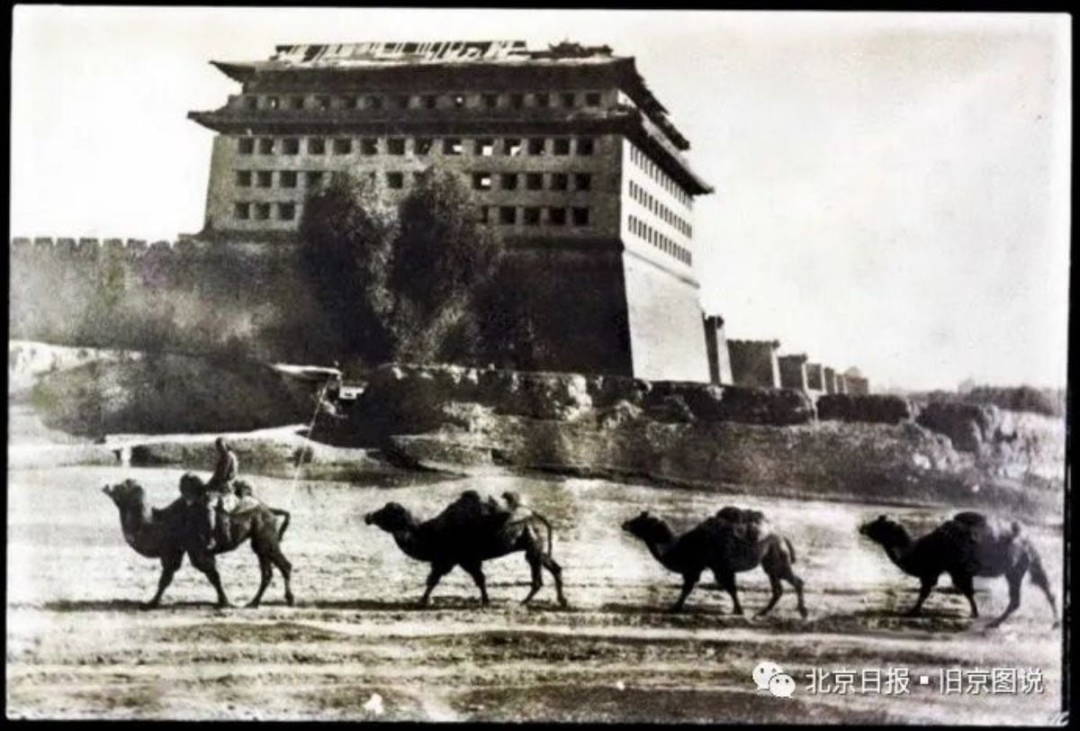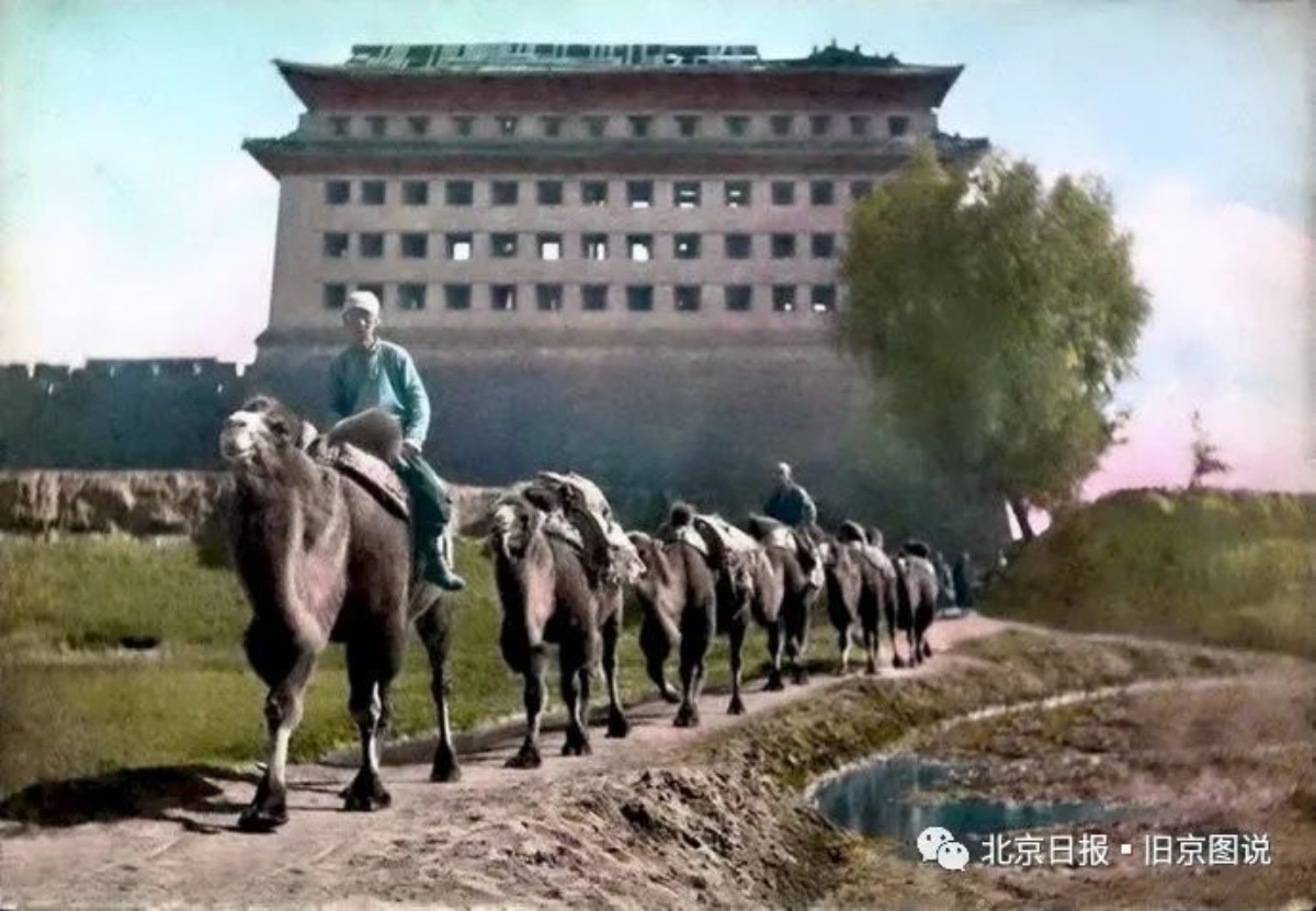 这是一队骆驼走过内城西南角楼下面,估计是在北京城里卸了煤,回房山的家,或者继续装煤去。他们走的这条小道是经过卢沟桥一直通往房山山里面的近路,也是除了从门头沟的煤窑经过西八里庄进阜成门之外的第二条往北京城运煤之路。