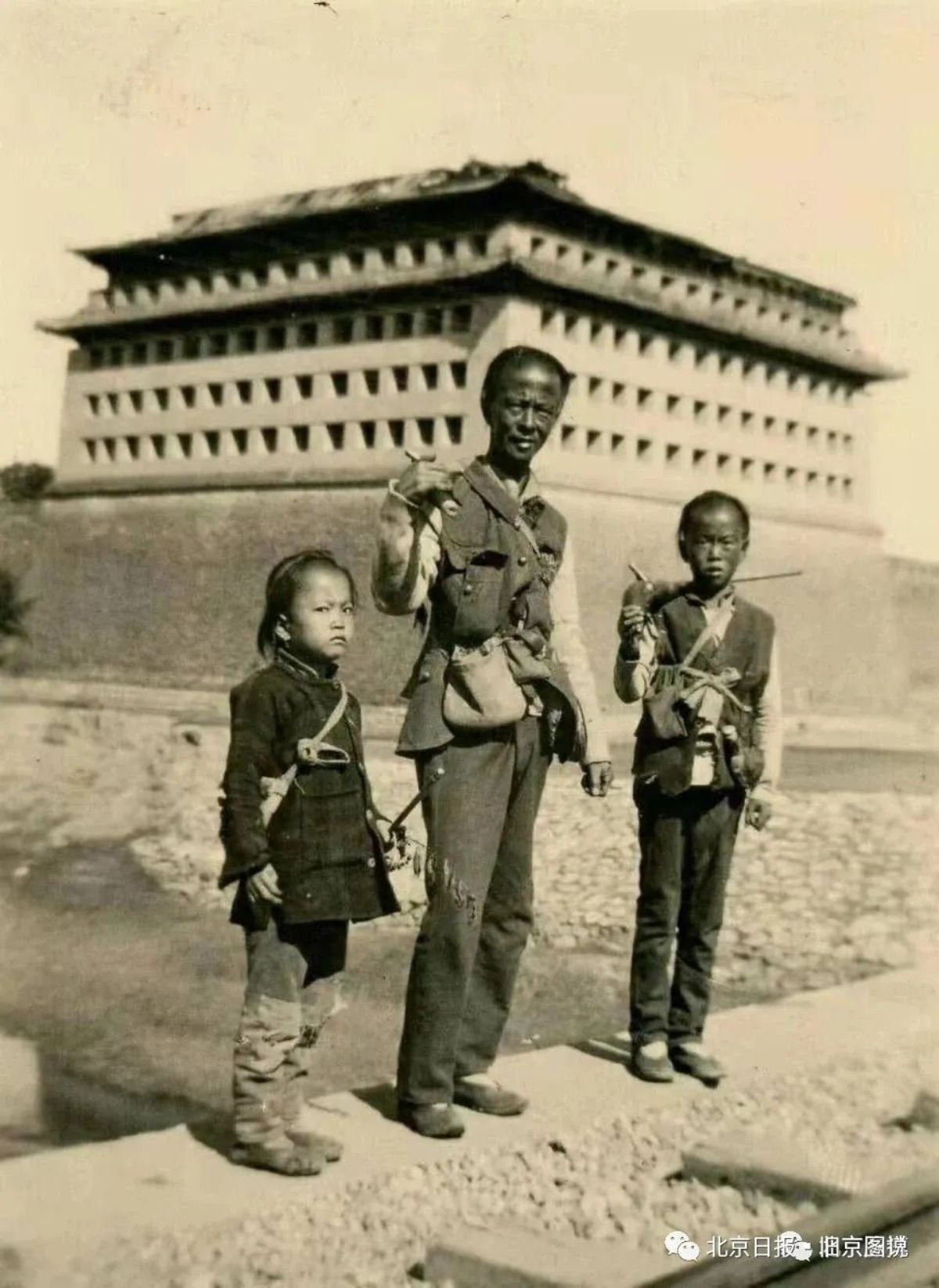 清朝末年,在西南角楼的西南方向拍摄的照片。照片近处是三个小孩儿,看着镜头,当时京汉铁路已经通车了,他们站在铁路旁边,远处是西南角楼。