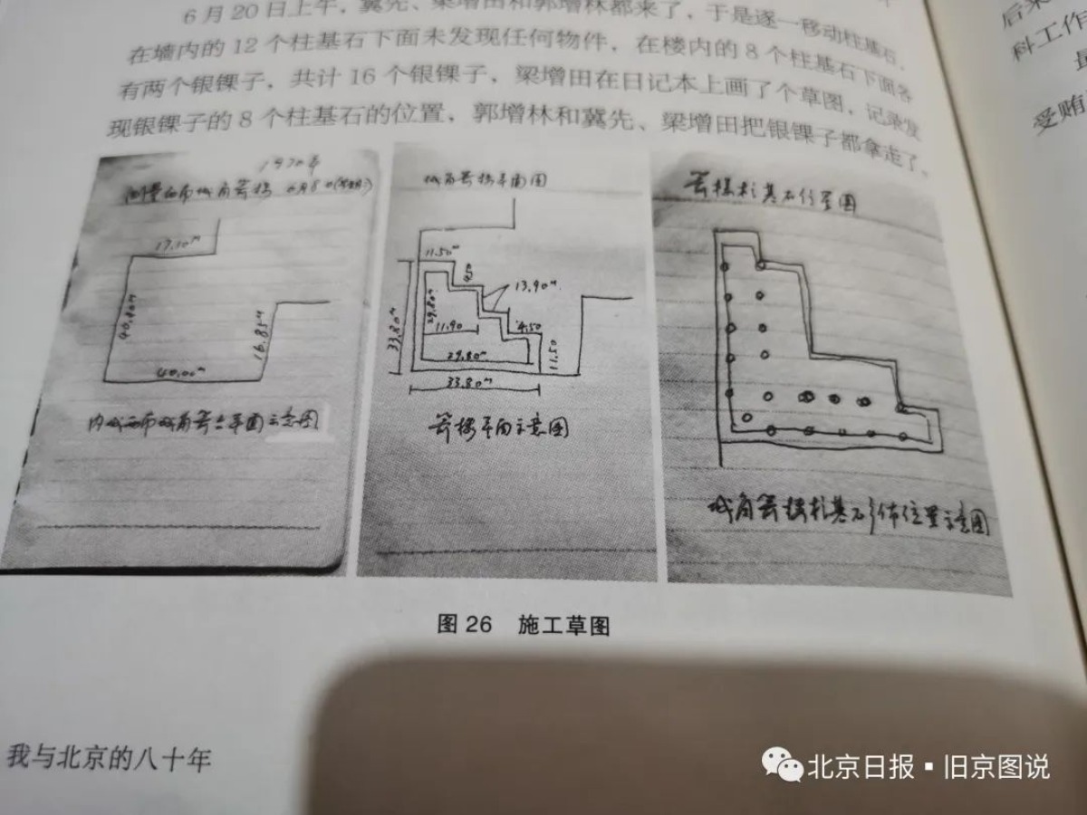 他还说,在拆角楼的木头立柱的时候,在角楼内的8个柱基石,每个下面发现了两个银锞子,一共是16个银锞子。而且他当时还画了三张草图: