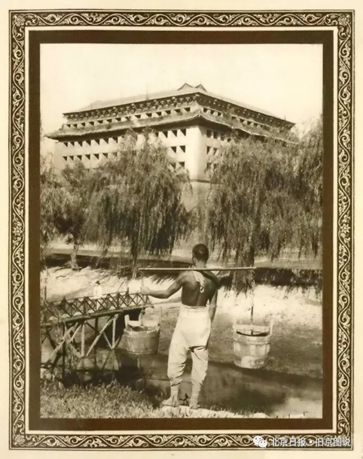 1927年,从西南向东北拍摄的内城西南角楼。角楼下面有一个人在护城河里挑水。那时候住在护城河附近的穷老百姓就吃护城河的水,有钱人才喝的起井水,更有钱的人才能买的起自来水。
