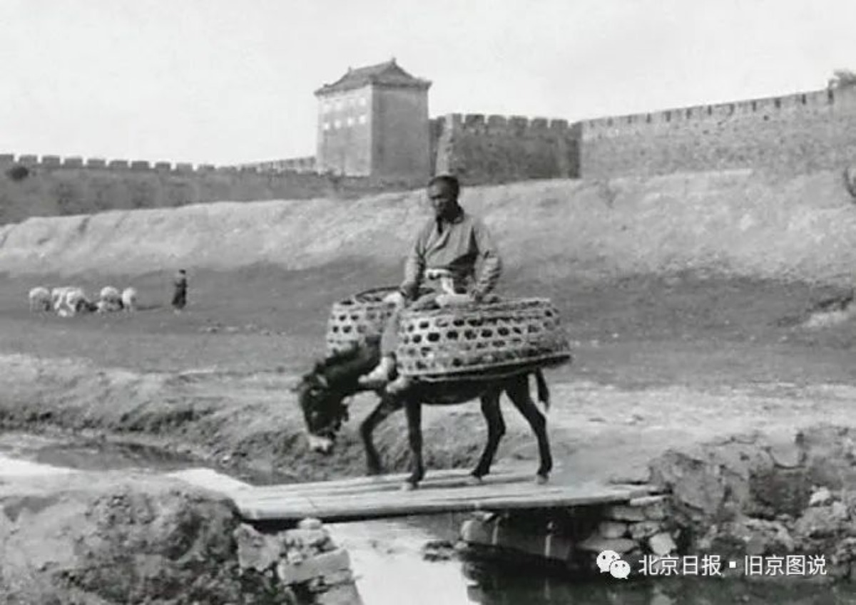 1905年,在西便门里从西南向东北方向拍摄的照片。近处是一个人骑着一头驴,经过西便门东水关流进外城的小河,远处左侧是是外城的北城墙,右侧是内城的西城墙,结合之处就是八瞪眼碉楼。