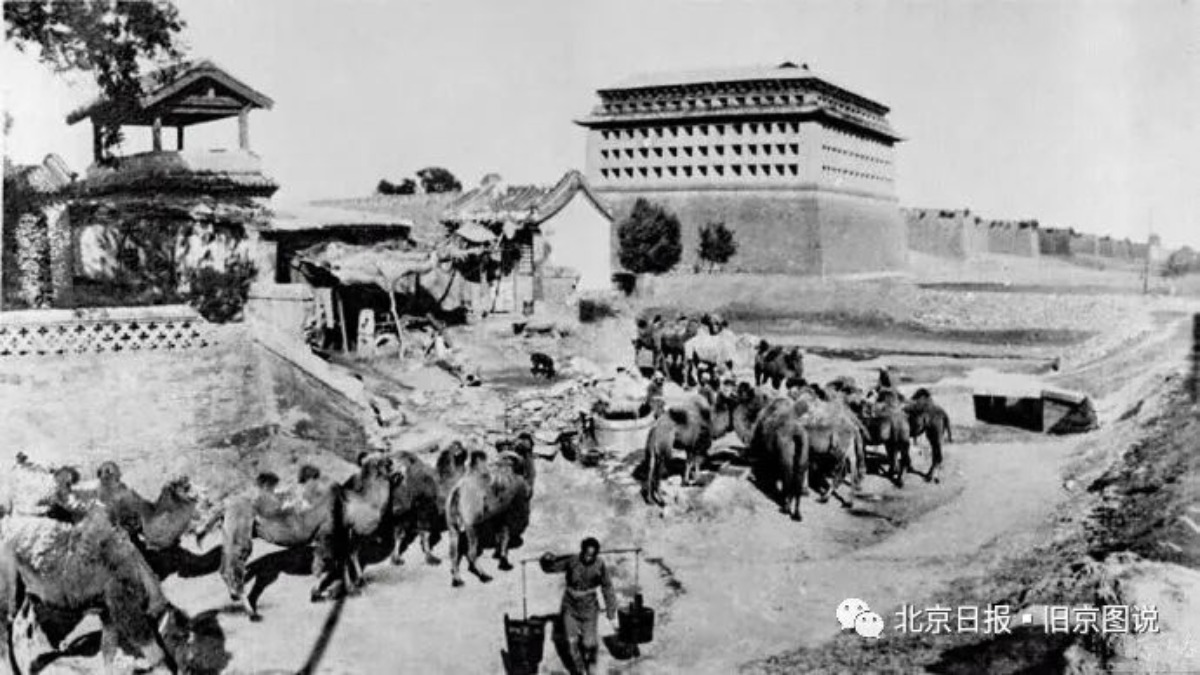 在1906至1909年之间,在西便门里的观音寺的外面往东北方向拍摄的照片,看照片上有很多的骆驼在喝水、休息,远处是内城的西南角楼。