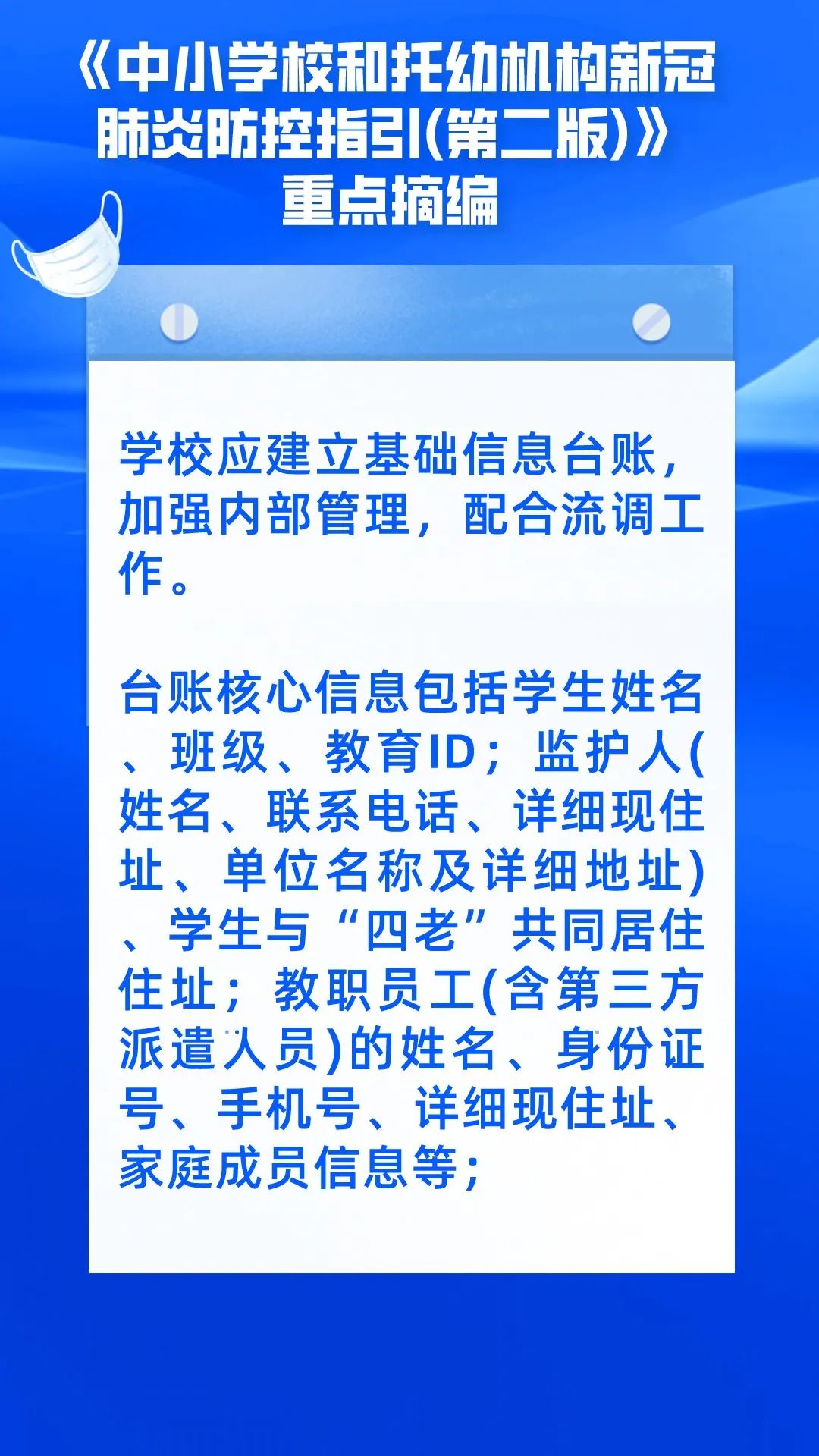 近日,北京市疾控中心发布《中小学校和托幼机构新冠肺炎防控指引(第二版)》,明确中小学校和托幼机构应当建立基础信息台账,学校要开展因病缺勤监测等内容。具体都有哪些呢?小编带着大家一起划个重点!