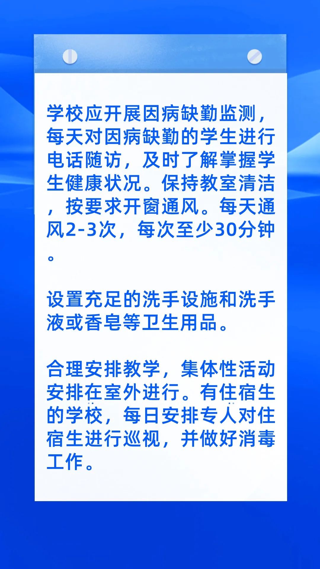 5、保持教室清洁,按要求开窗通风。每天通风2-3次,每次至少30分钟。
