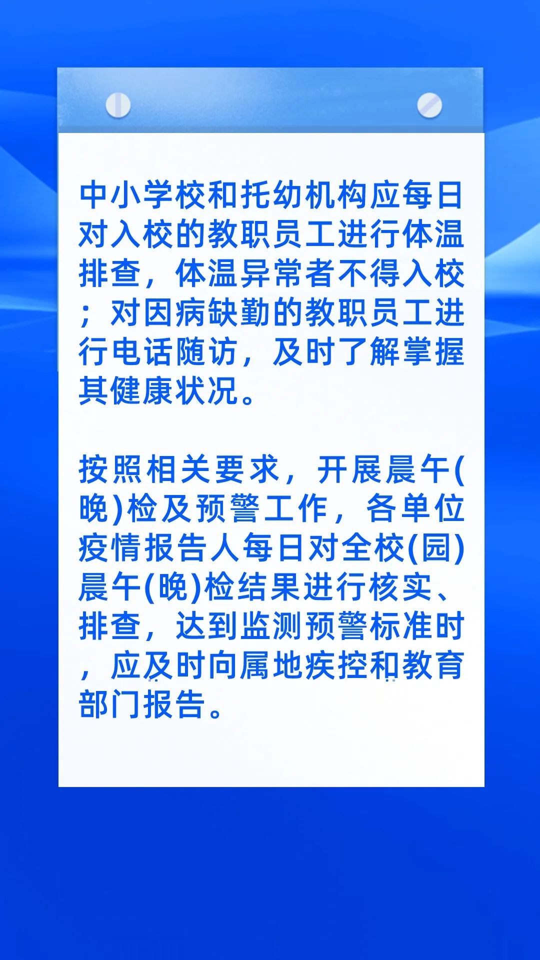 3、按照《中小学校传染病预防控制工作管理规范GB28932-2012》、《学校传染病症状监测预警技术指南(WS/T722-2020)》要求开展晨午(晚)检及预警工作,各单位疫情报告人每日对全校(园)晨午(晚)检结果进行核实、排查,达到监测预警标准时,应及时向属地疾控和教育部门报告。如有出现发热、咳嗽等新冠疫情相关症状的学生,应立即送往临时等候区,并通知家长带孩子及时就医,参照《新型冠状病毒感染的肺炎流行期间公众出现发热呼吸道症状后的就诊指引》。