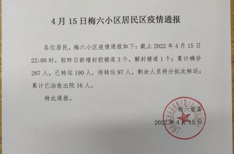 居民怎么会知道小区转运速度慢?原来,梅六小区的防疫信息始终公开,居委会每天用移动喇叭通报最新信息,包括哪个门栋有阳性居民,全都对外公布。根据15日的通报信息,小区累计确诊人数287人,已经转运190人,待转运97人。相比前一天数据,小区已转走52位感染者居民,转运速度已经明显提升。不过,由于整体基数比较大,加上小区内老年居民较多,小区待转运人数或会停留在相对高位。