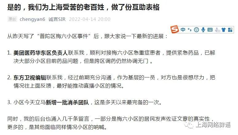 记者随即联系博主“诚言SIR”,他透露文章内容最早源自梅六小区多位居民的求助,“是三个居住在这里的年轻人找到我,告诉我‘小区快不行了,马上有可能全部都阳性!’”一直在厦门关注上海疫情发展的“诚言SIR”,经过和居民代表的反复沟通,发布了一篇和篮球并不相关的内容,“希望让更多人关注上海居民的真实情况”。