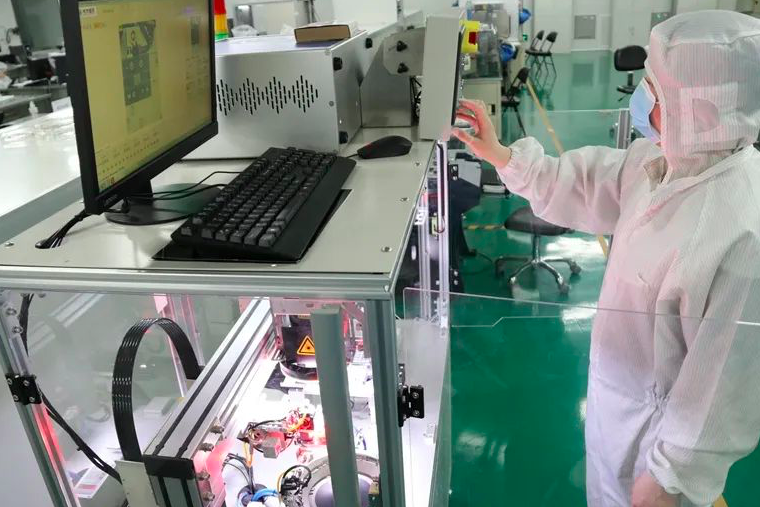 技能人员正在操作全自动激光打标机,该设备可以自动将元器件进行编号及标识,相当于为元器件制作身份证,方便对其进行溯源,保证产品质量。