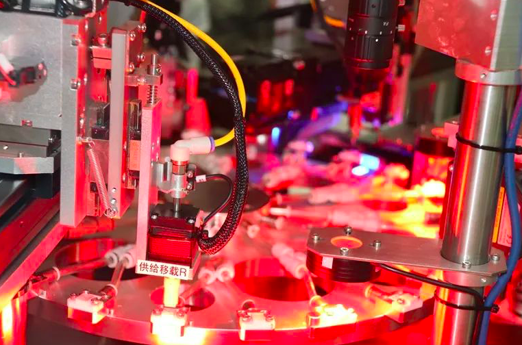 全自动上架点胶机正在运转,该设备可以自动完成晶体元器件的上架点胶工序,比之前半自动点胶设备效率提高一倍。