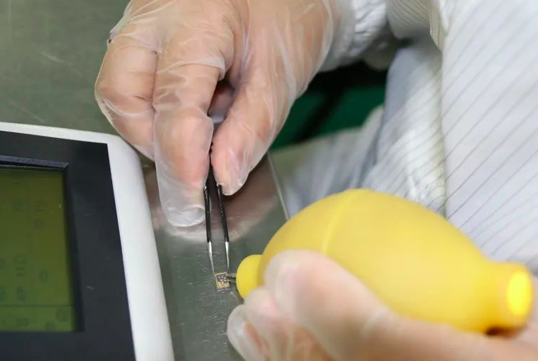 技能人员正在清理芯片表面的微观多余物,将芯片表面的微尘或微小金属屑吹掉,保证产品内部不存在多余物。
