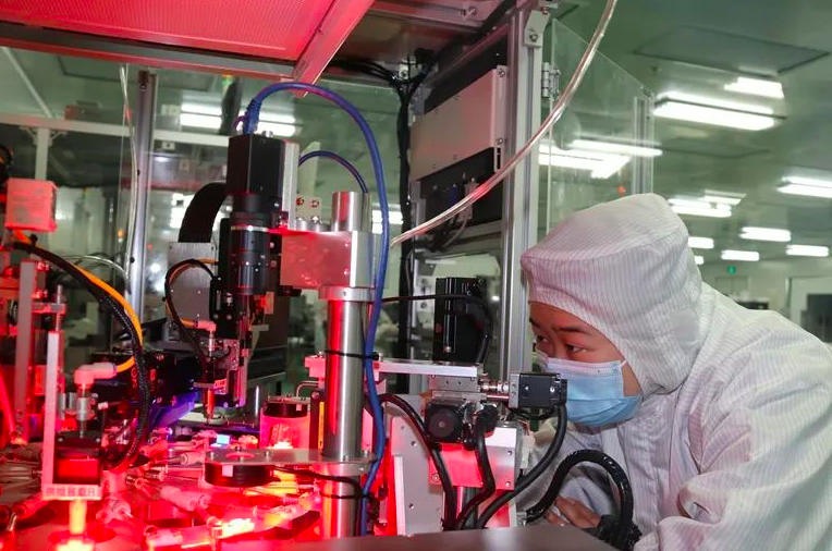 技能人员正在操作全自动上架点胶机,该设备可以对小到绿豆大小的晶体元器件进行上架点胶工序的操作,实现微型晶体元器件的装配工作。