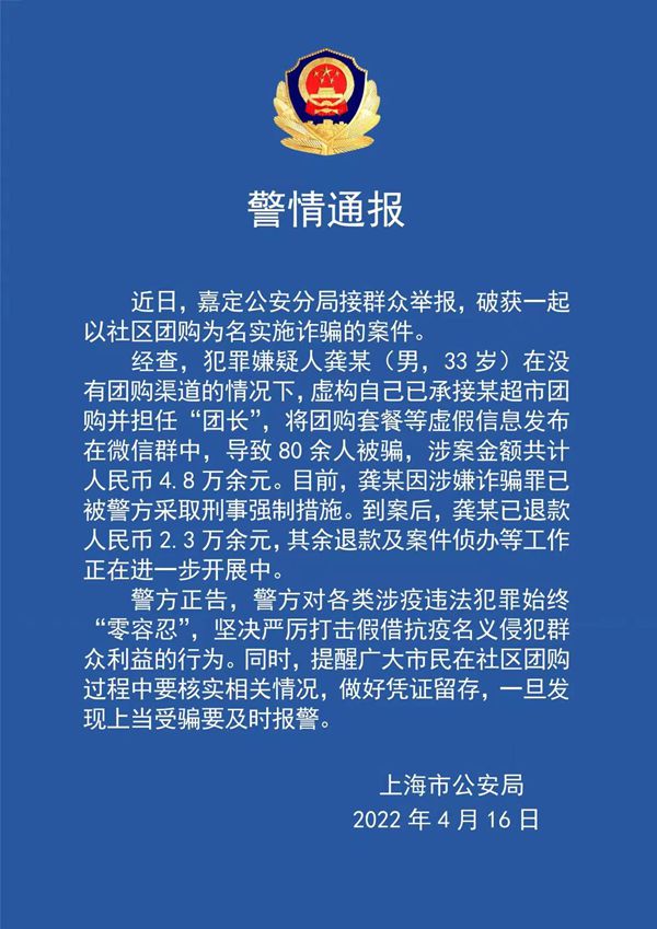 经查,犯罪嫌疑人龚某(男,33岁)在没有团购渠道的情况下,虚构自己已承接某超市团购并担任“团长”,将团购套餐等虚假信息发布在微信群中,导致80余人被骗,涉案金额共计人民币4.8万余元。目前,龚某因涉嫌诈骗罪已被警方采取刑事强制措施。到案后,龚某已退款人民币2.3万余元,其余退款及案件侦办等工作正在进一步开展中。