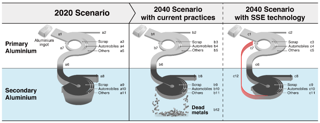 与铁、铜并列,铝是社会上广泛使用的三大基础金属之一,除铝土矿电解生产的原铝外,世界铝循环中52%的铝合金为再生铝合金。在工业中,铝通常与硅、铜、镁及其他元素一起合金化,铝合金基本上分为两种类型:锻造合金通常含有约5%的合金元素,而铸造合金含有6%到27%。铝的化学性质使得依靠传统再熔工艺无法除去废旧铝中的合金元素,因此目前的铝回收再生只能是降级使用,其中主要用于以汽车发动机为代表的铸造合金。未来,电动汽车的发展将大幅度的降低这一类铸造合金的需求,同时提高对于高纯度铝的需求。因此铝的回收再生策略自然也需要做根本的改变。如果保持目前的铝再生方式,预测到2040年将有360万吨二次铝成为无法再使用的“死金属”(图1)。