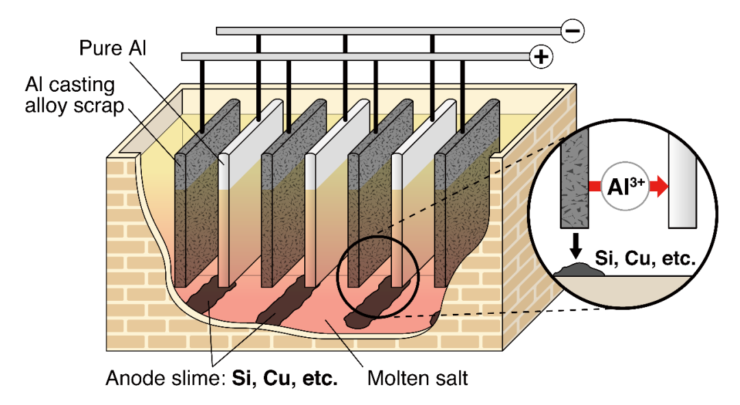 为了通过升级回收废旧铝来实现铝的真正可持续性,本研究开发了以熔融盐为电解质的新型固态电解(SSE)铝工艺 。其原理如图2所示。为了确保废铝保持固态,熔融盐电解质的熔点必须低于铝合金的熔点,典型的Al-Si-Cu铸造铝合金约为580℃,此外,熔盐电解质还具有电导率高、电化学电位窗口宽、操作方便、成本低等优点。碱金属氯化物、碱土金属氯化物或它们的混合物是很有前途的SSE电解质,它们具有广泛的电化学电位窗口和相对较低的成本。考虑到上述要求,该项研究中使用了两种不同的电解质:MgCl2-NaCl-KCl(47.1 mol% MgCl2-30.2 mol% NaCl-22.7 mol% KCl: 385℃)和LiCl-KCl(58.6 mol% LiCl-41.4 mol% KCl: 353℃)。
