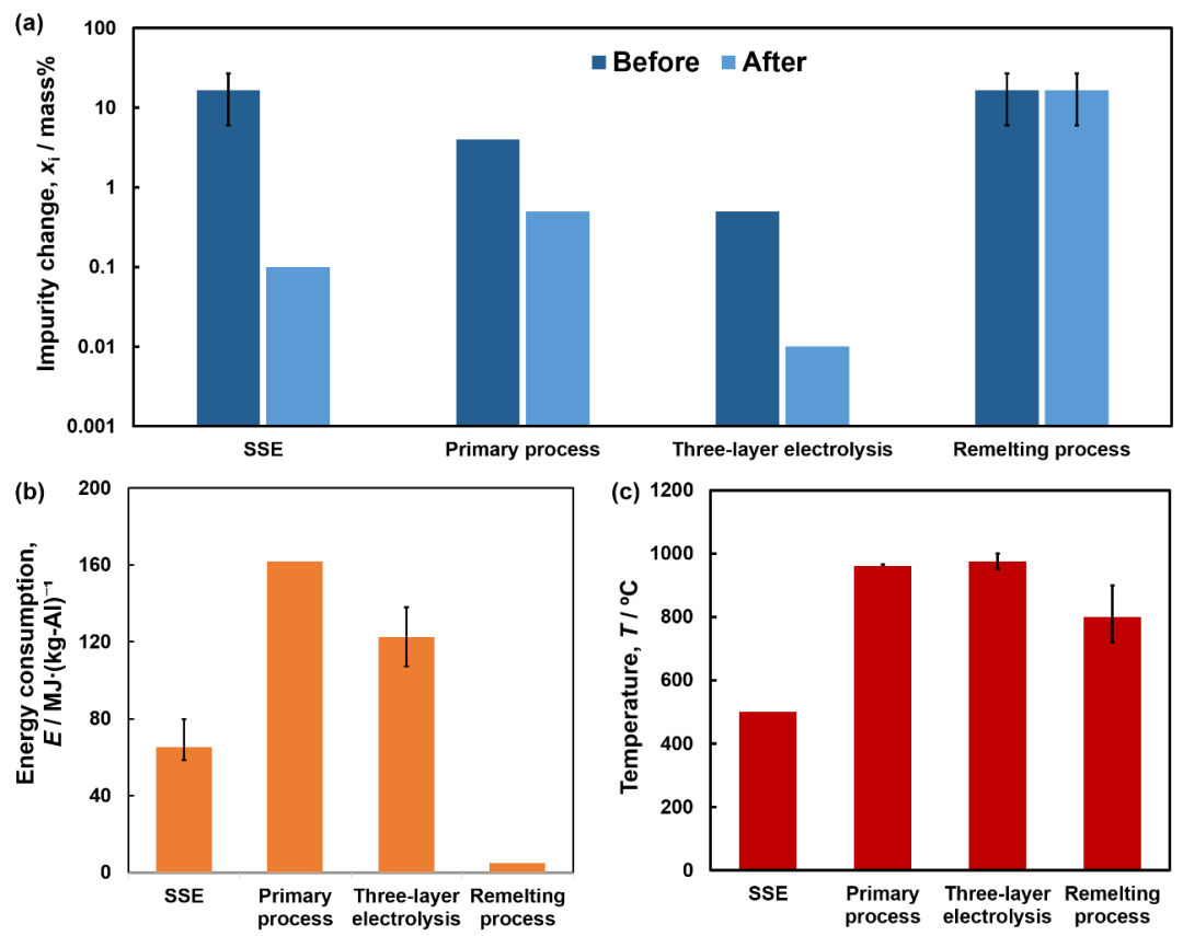 以废铝为原料,仅使用不到原铝生产一半的能耗,生产出纯度与原铝相当的再生铝,SSE工艺基于熔融盐电解原理,具有巨大的工业化应用潜力。特别是成熟的熔盐电解工业技术,为SSE工艺的规模扩大和工业应用提供了指导。本研究的结果证明了SSE的技术优势,包括其去除杂质的能力和低能耗。考虑到未来铝市场中可能出现的各种挑战,本文的SSE工艺所代表的技术为走向真正可持续的铝供应铺平了道路,有望成为工业层面上实现真正可持续性发展 的模型。