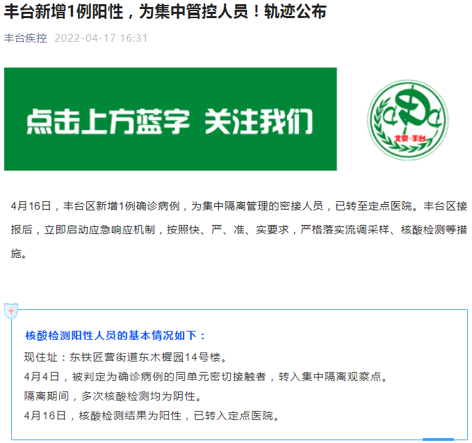 4月16日,丰台区新增一例核酸阳性人员,为集中隔离管理的密接人员,已转至定点医院。丰台区接报后,立即启动应急响应机制,按照快、严、准、实要求,严格落实流调采样、核酸检测等措施。