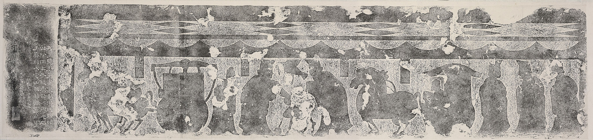 画像石拓片,纵:38厘米,横:165厘米。此孔子见老子画像石系武氏祠画像石之一。石原在山东嘉祥紫云山,清乾隆五十一年(1786年),黄易访得移至济宁州学。石现藏山东济宁博物馆汉碑室。