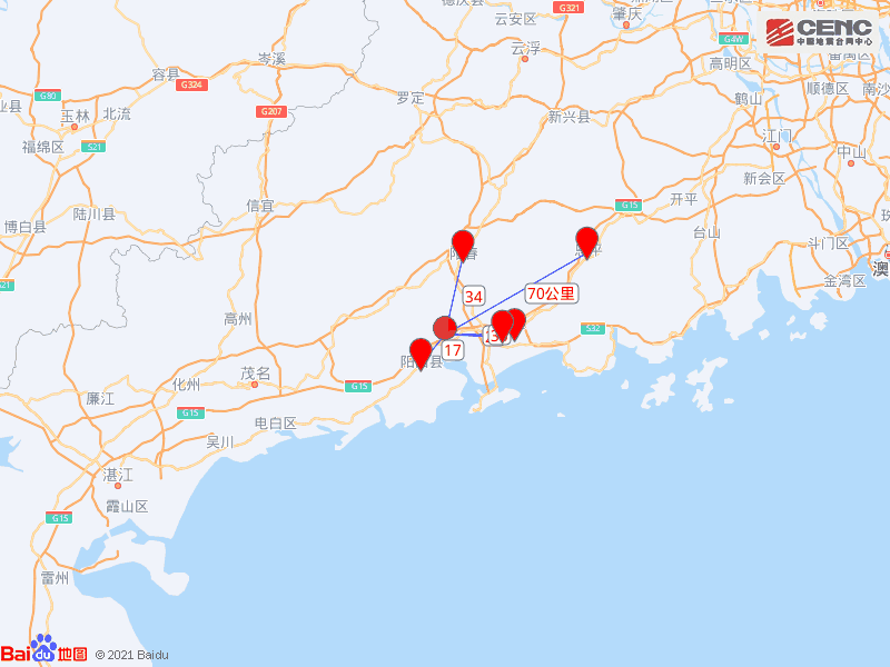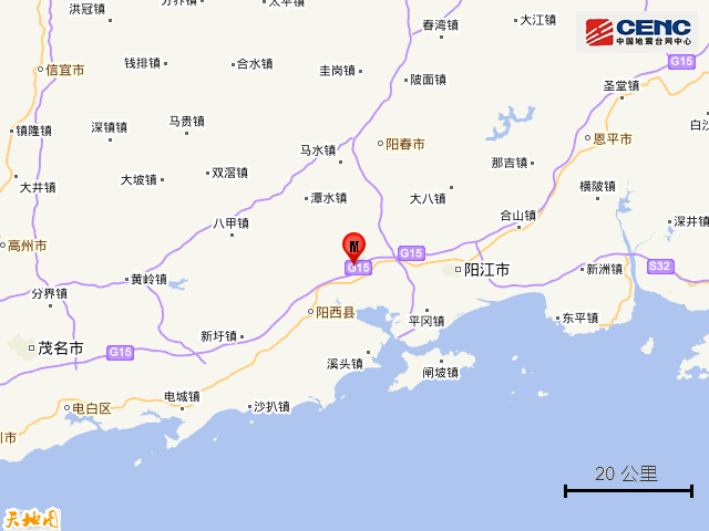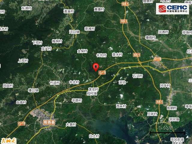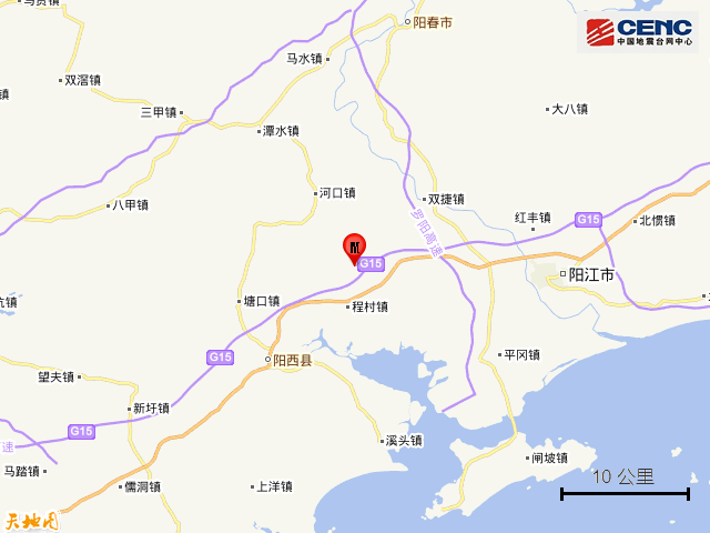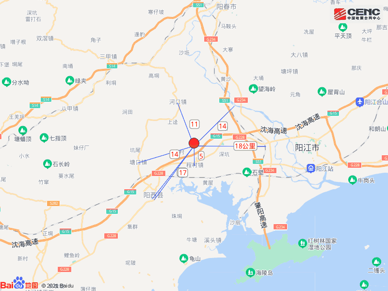 周边县城:震中距阳西县17公里、距江城区24公里、距阳东区30公里、距阳春市34公里、距恩平市70公里,距阳江市27公里。