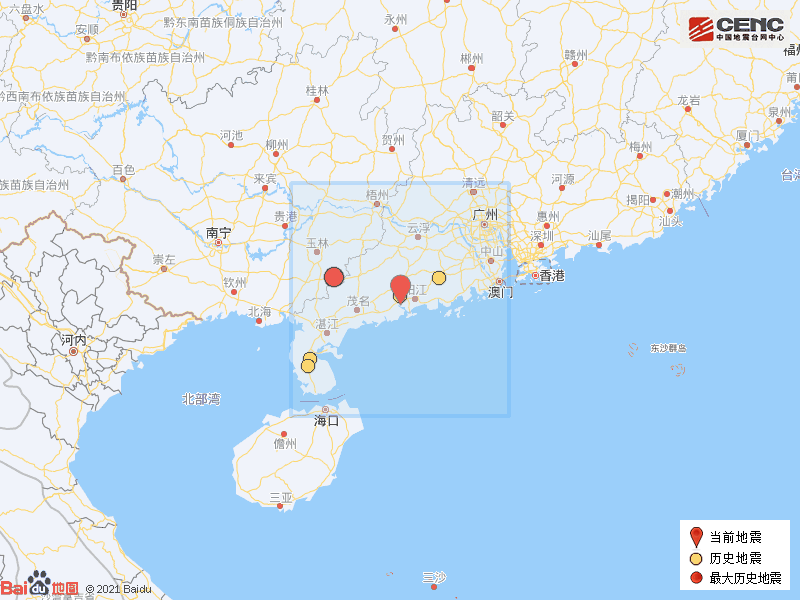 历史地震:根据中国地震台网速报目录,震中周边200公里内近5年来发生3级以上地震共7次,最大地震是2019年10月12日在广西玉林市北流市发生的5.2级地震(距离本次震中130公里),历史地震分布如图。