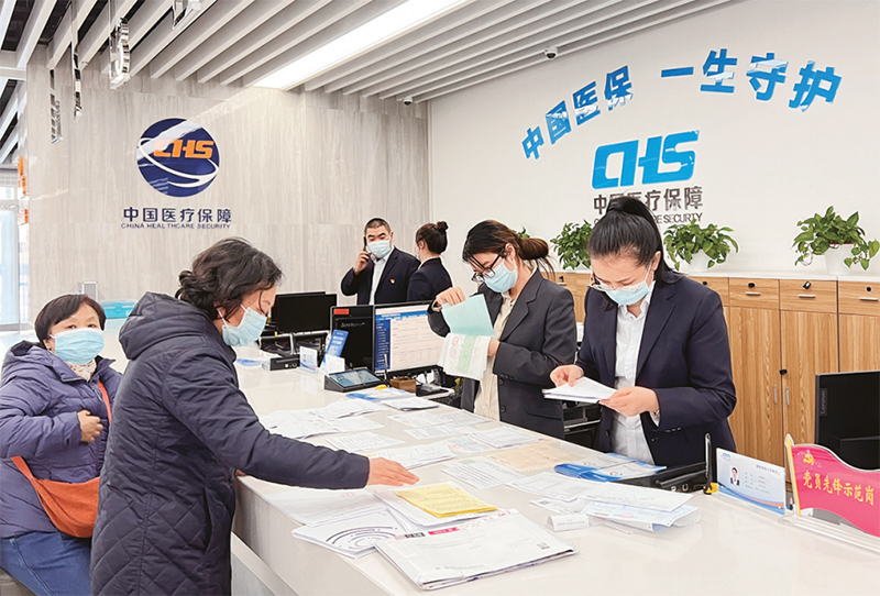 中国用较短时间建立起世界最大的全民基本医疗保障网,对破解群众看病难看病贵问题、支持医药卫生事业发展、维护社会稳定和推动共同富裕发挥了重要作用。图为2022年3月1日,甘肃省酒泉市医保经办窗口工作人员正在为群众办理医保业务。国家医疗保障局供图 郑惠亚/摄