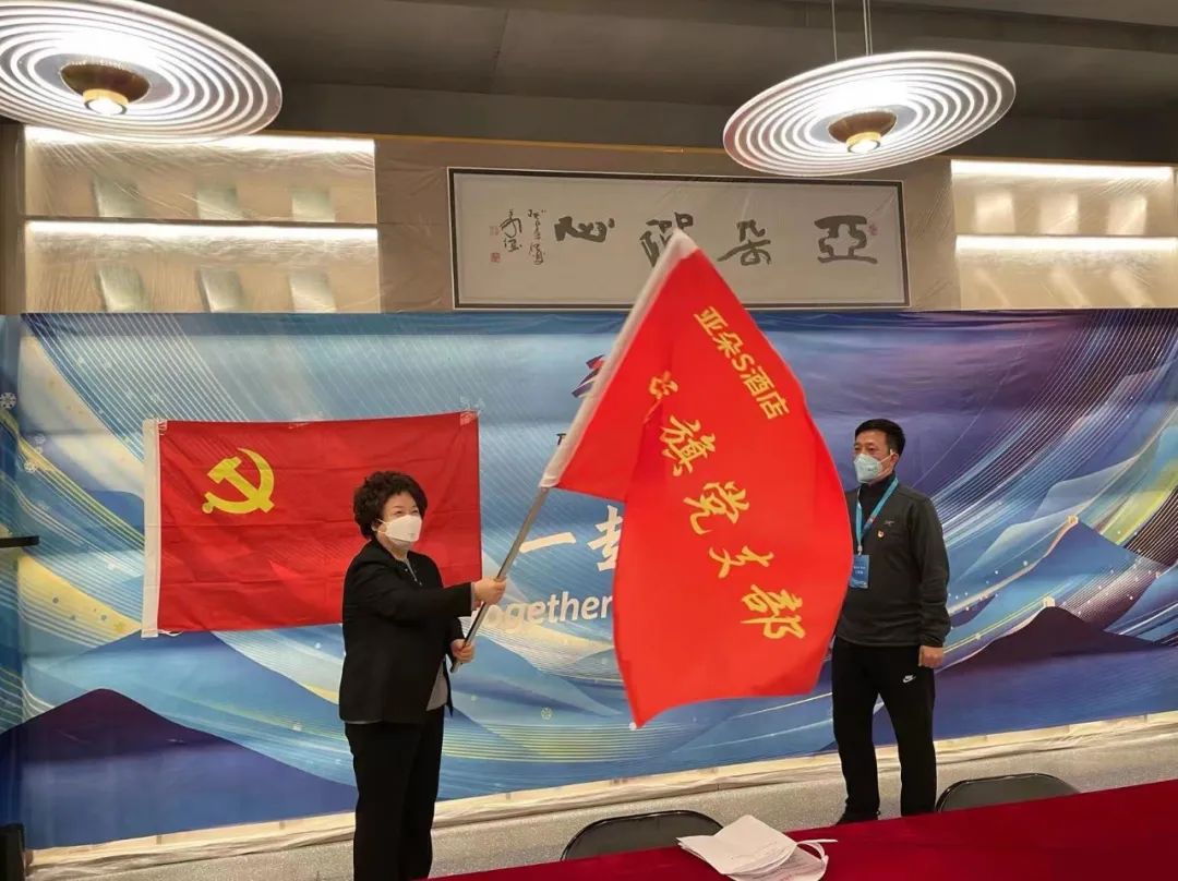 海淀区赛事综合保障组组长、海淀区委巡察机构副处级巡察专员席秀东,在亚朵S酒店战旗党支部成立时接受授旗。