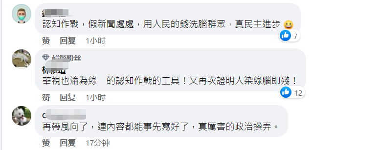 有网友直指华视背后的民进党当局,“你的后台是当今执政党!”“华视也沦为认知作战的工具,染绿即残”。