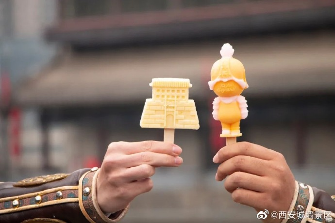 西安城墙融合当下时尚潮流元素与古都千年文化精髓,推出“城墙味道”冰激凌,造型有饱含历史气息的卡通永宁门、有盔帽甲胄的“大唐羽林军”,还有高髻圆脸的“雪贵妃”,分芒果、抹茶、巧克力、草莓四种口味,近年来也成为来西安城墙观光旅游的网红打卡项目。