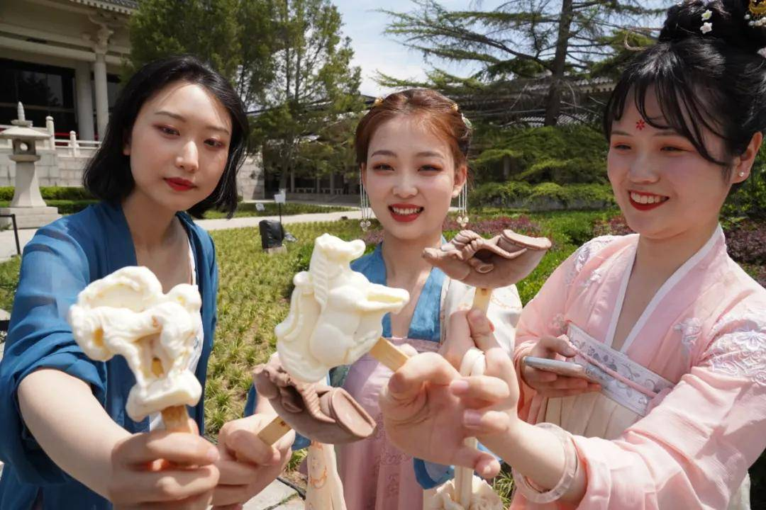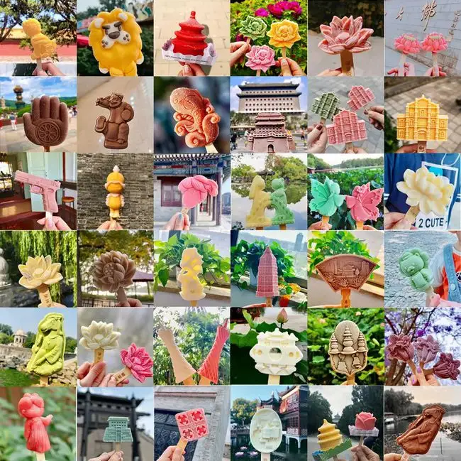 兵马俑、城墙、大唐武士仕女、镶金兽首玛瑙杯、金怪兽、杜虎符、舞马衔杯纹银壶等形态的雪糕也各具特色。简简单单一支带有景区标志图样的雪糕,不知不觉中已成为出游打卡必备单品。