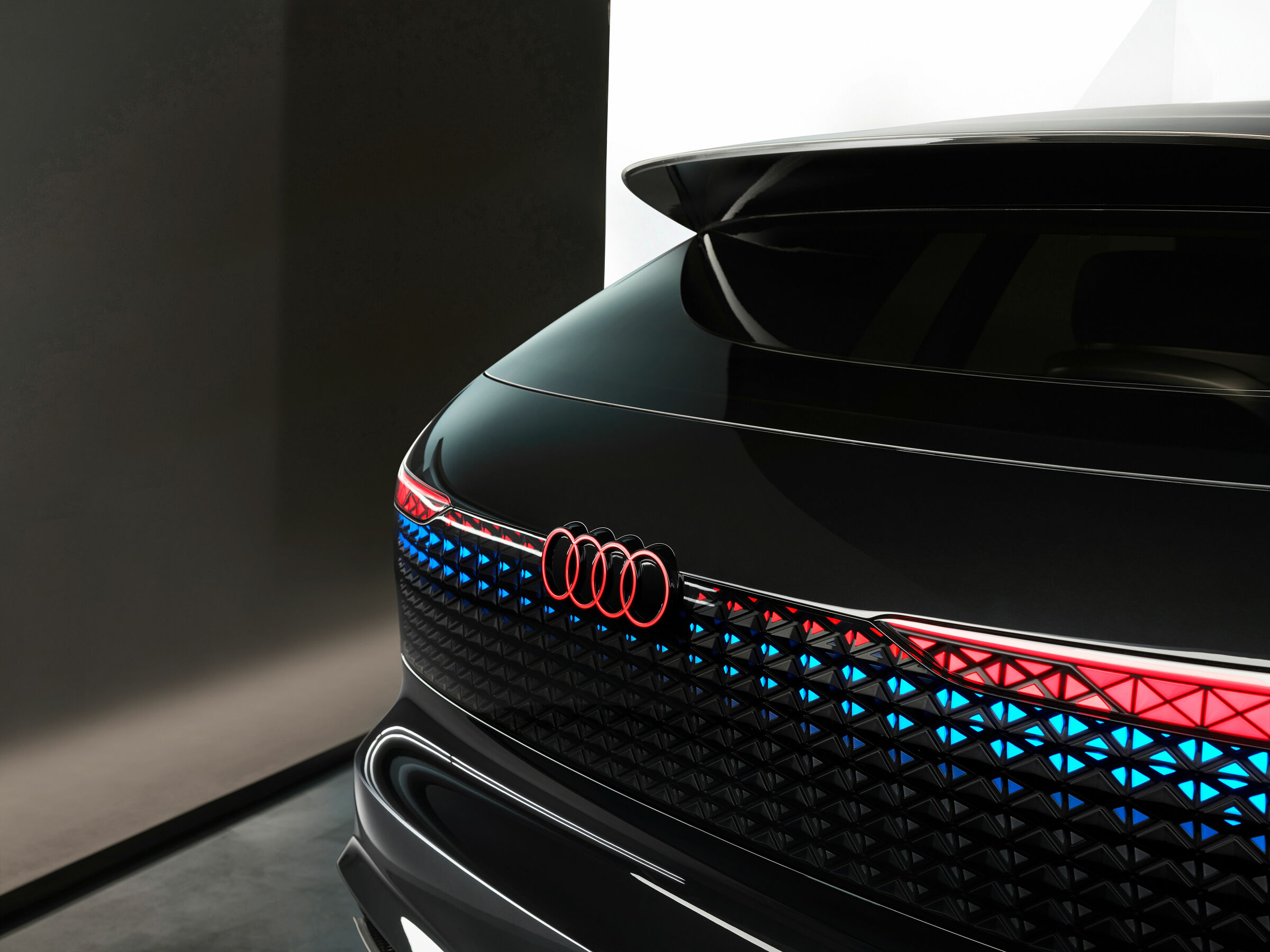一体式格栅内部的灯面仿佛一座舞台或一块画布(正如其“奥迪灯光画布”的称呼),具有独特交互式功能,能通过动态照明效果向其他车辆或行人发出明确信号,提高驾驶安全。车尾也有类似功能的矩阵式LED光面。