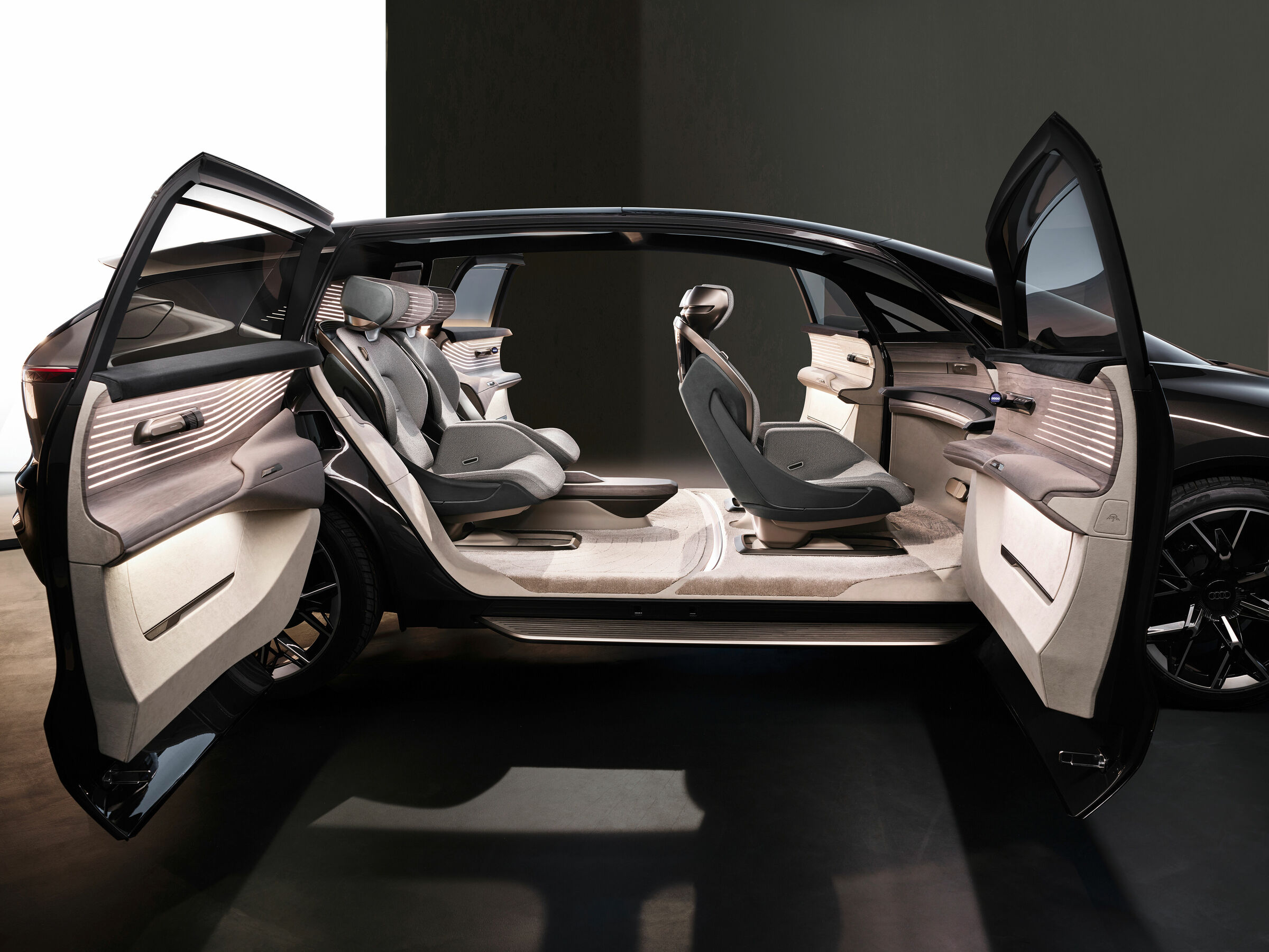 奥迪urbansphere概念车车门前后采用对开门设计,并取消了B柱。当乘客上车时,整个车内空间会面向乘客敞开。与此同时,座椅向外旋转,一束灯光“红毯”般点亮,充满富有情感的仪式感。
